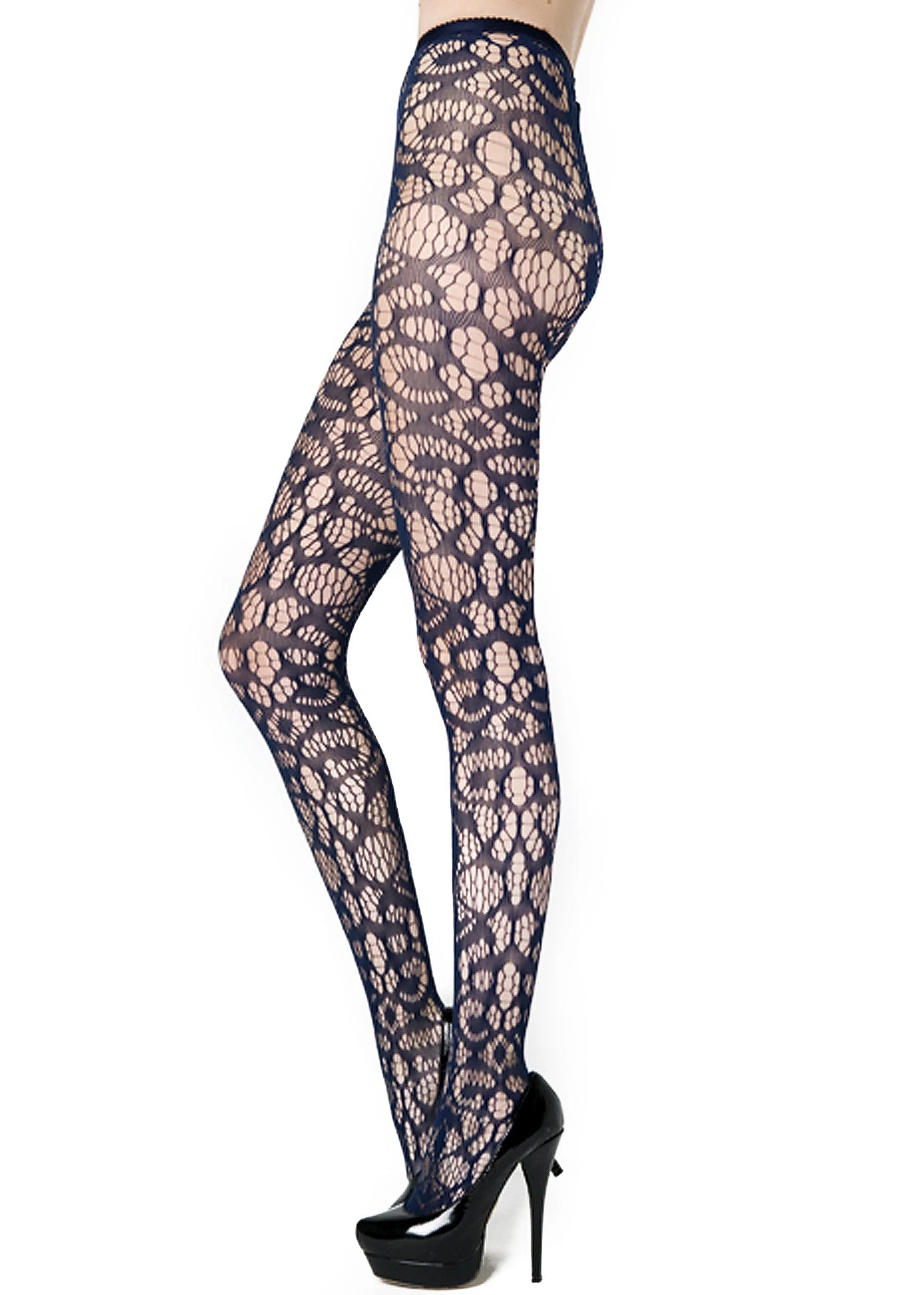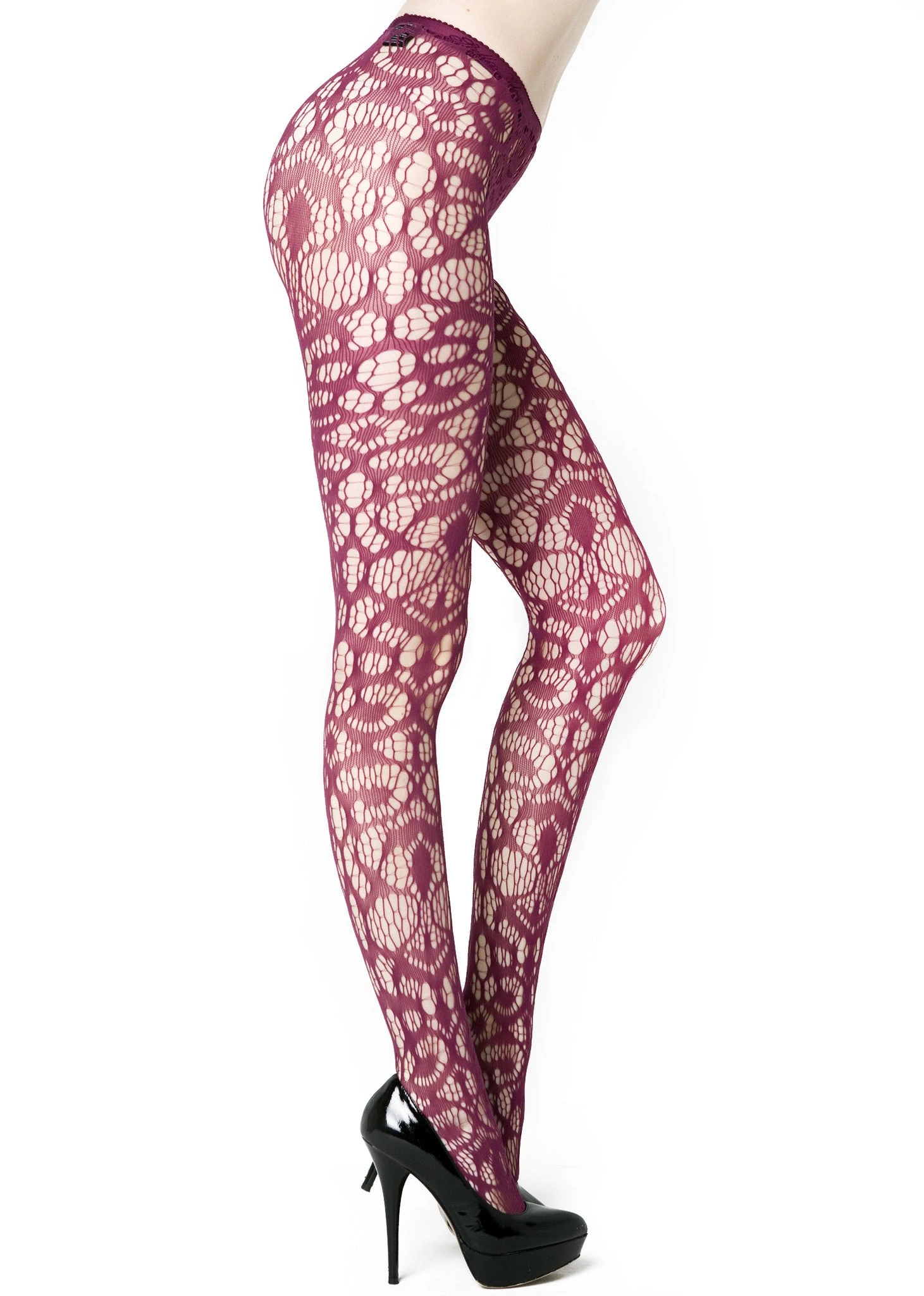 Modern abstract circular and crescent shapes wrap around the legs of these colored fishnet pantyhose from elastic waistband to toe. Available in regular and plus size. Reinforced toe and cotton gusset for additional support.