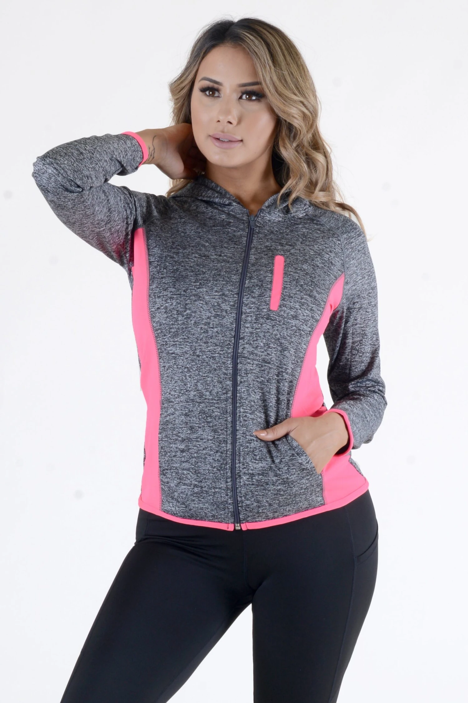 This workout jacket is for making moves on or off the court with sporty color block detail and a hoodie on back. Â