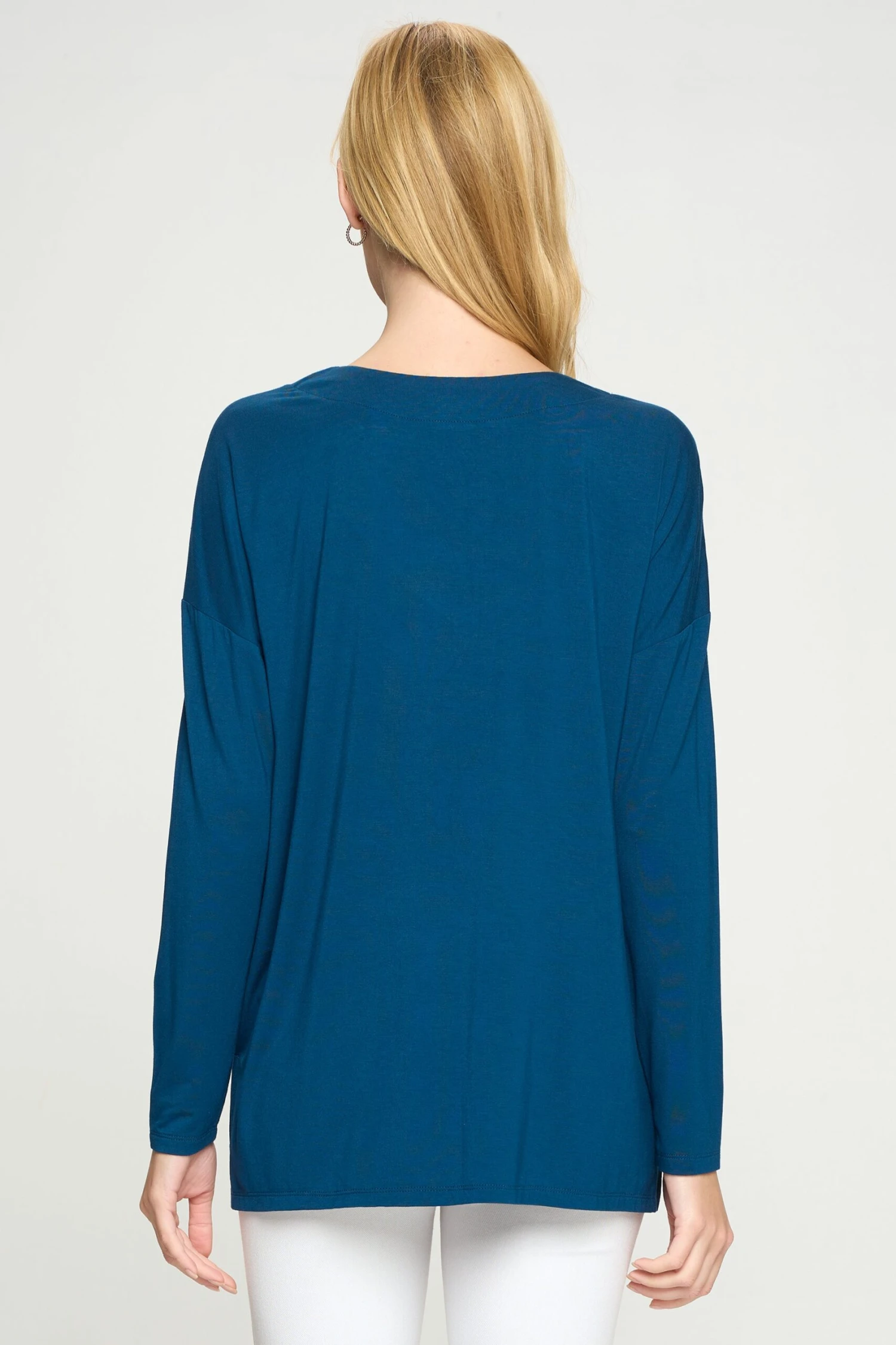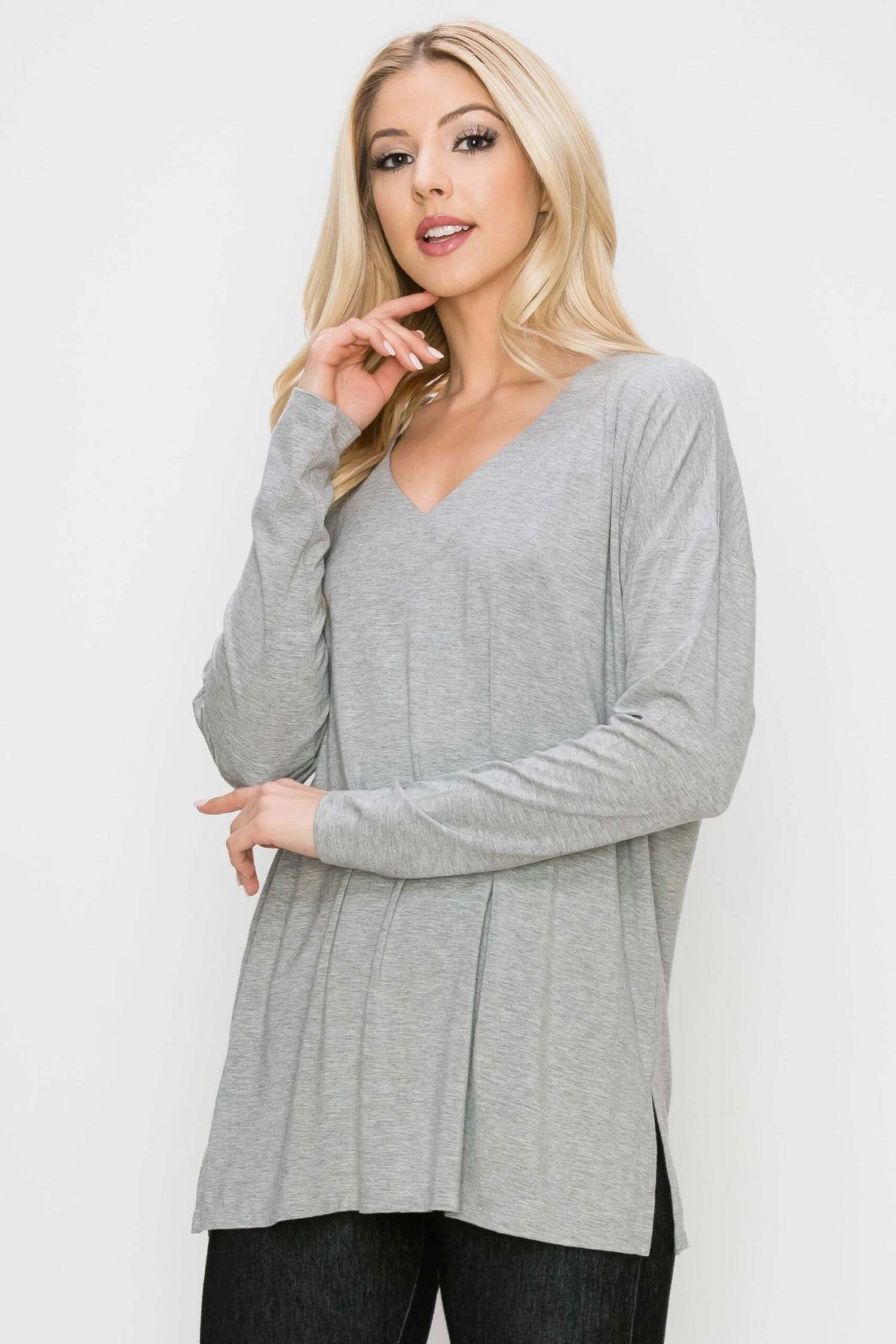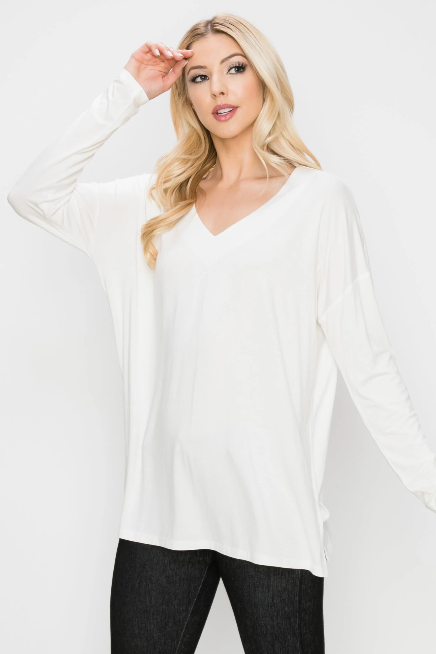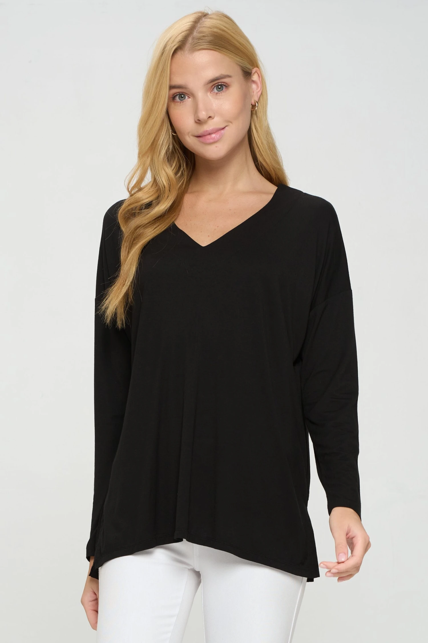 Lightweight and always flattering, this basic V-neck long sleeve top is a closet necessity. Dress it up with a cardigan or wear it by itself. You’ll keep going back to wear this ultra-soft essential.
