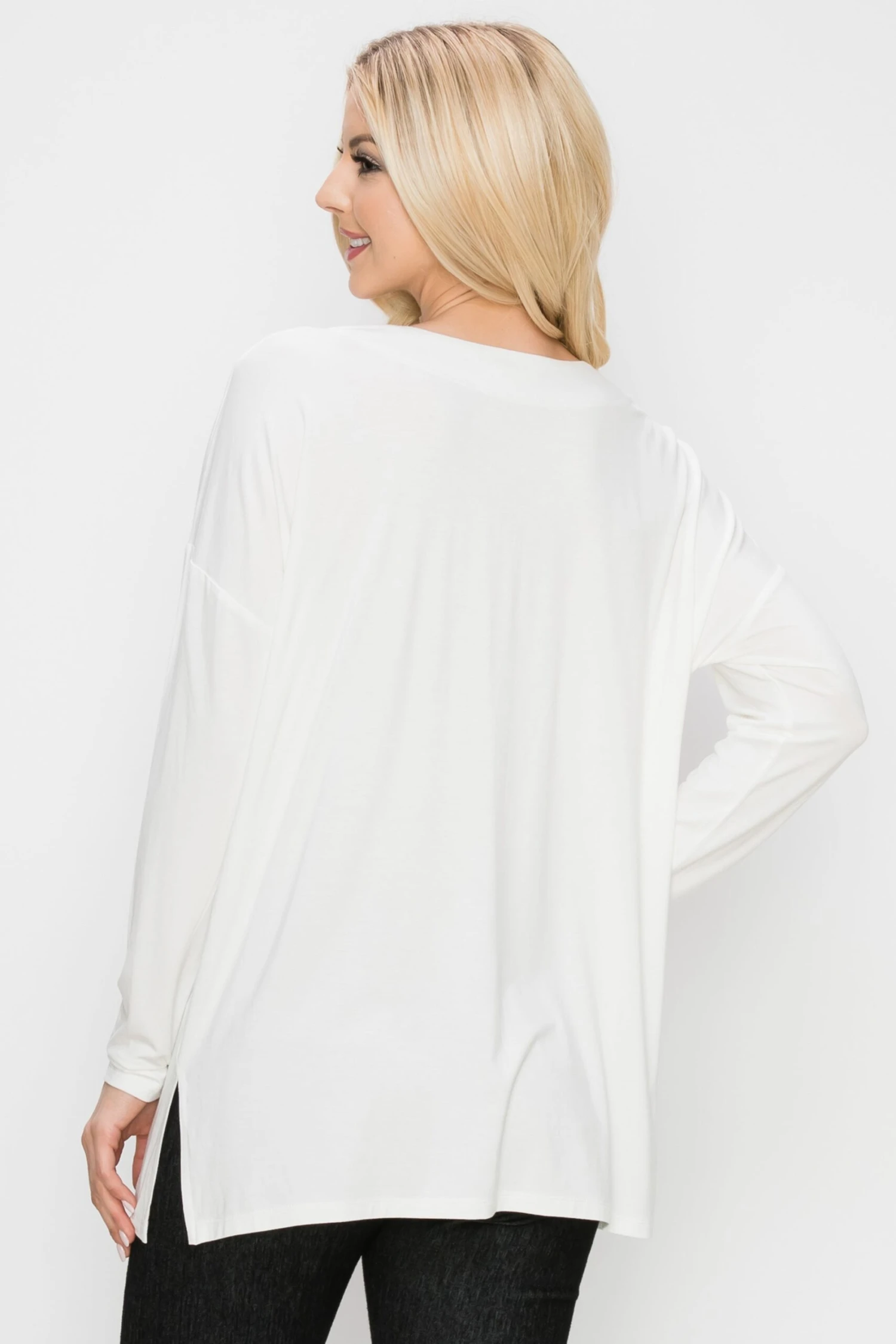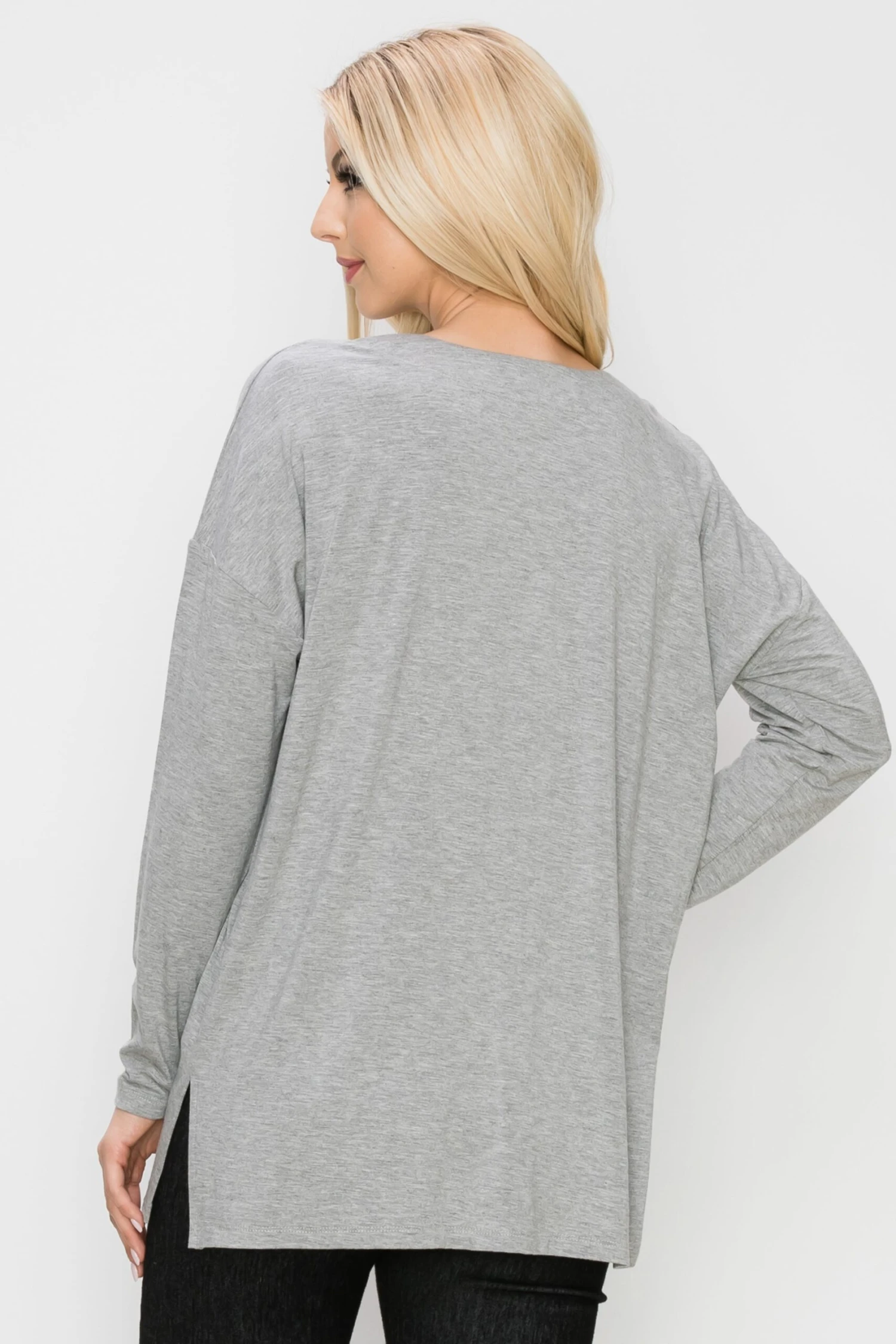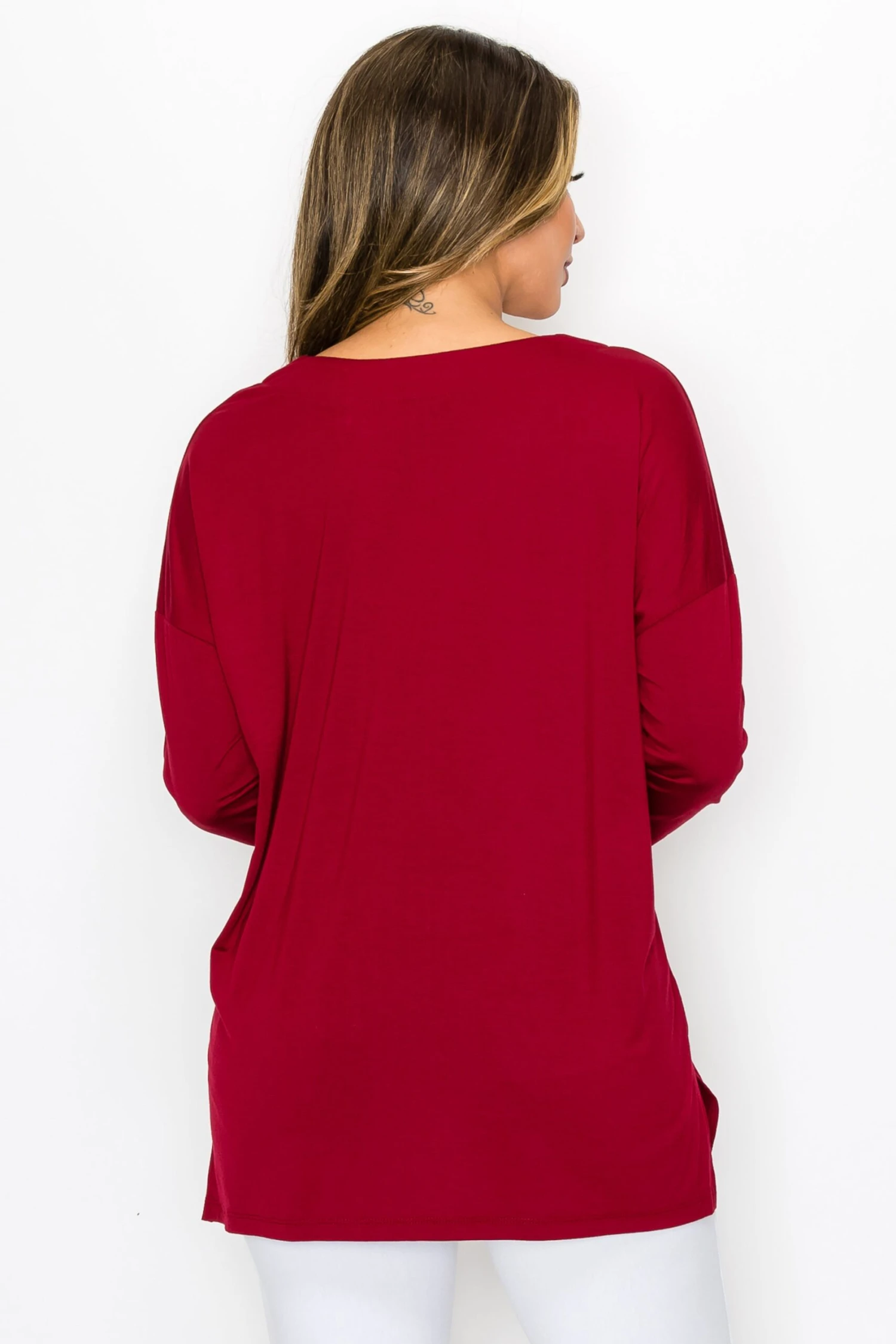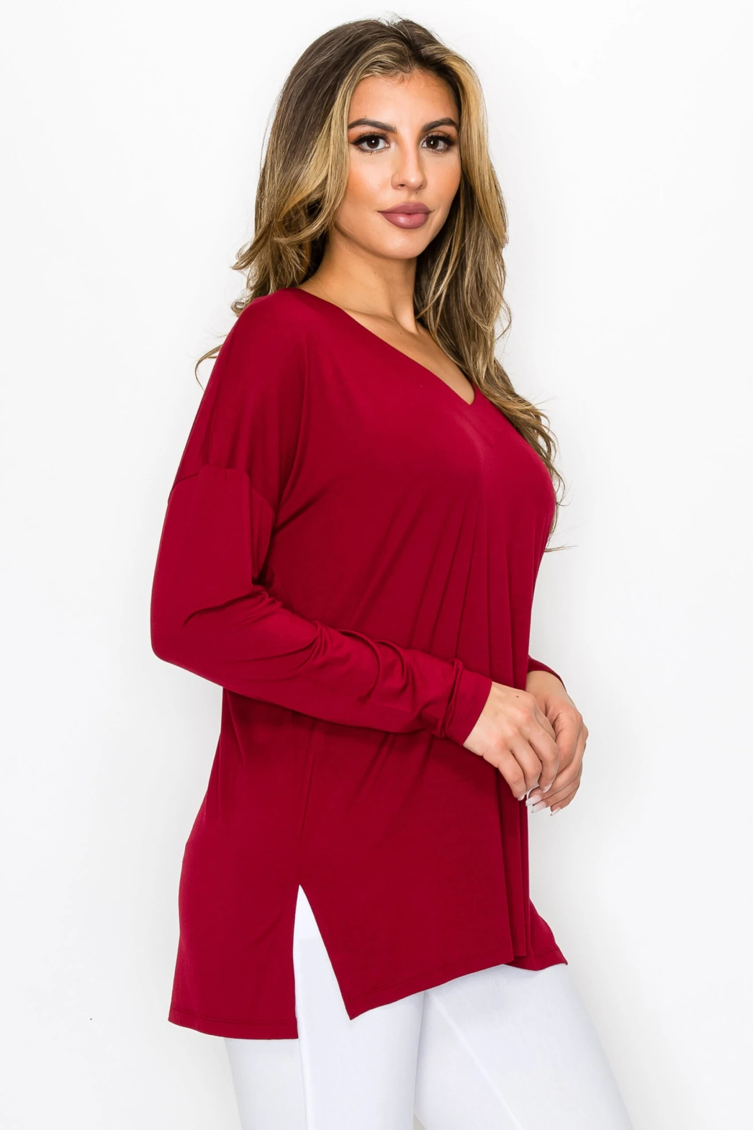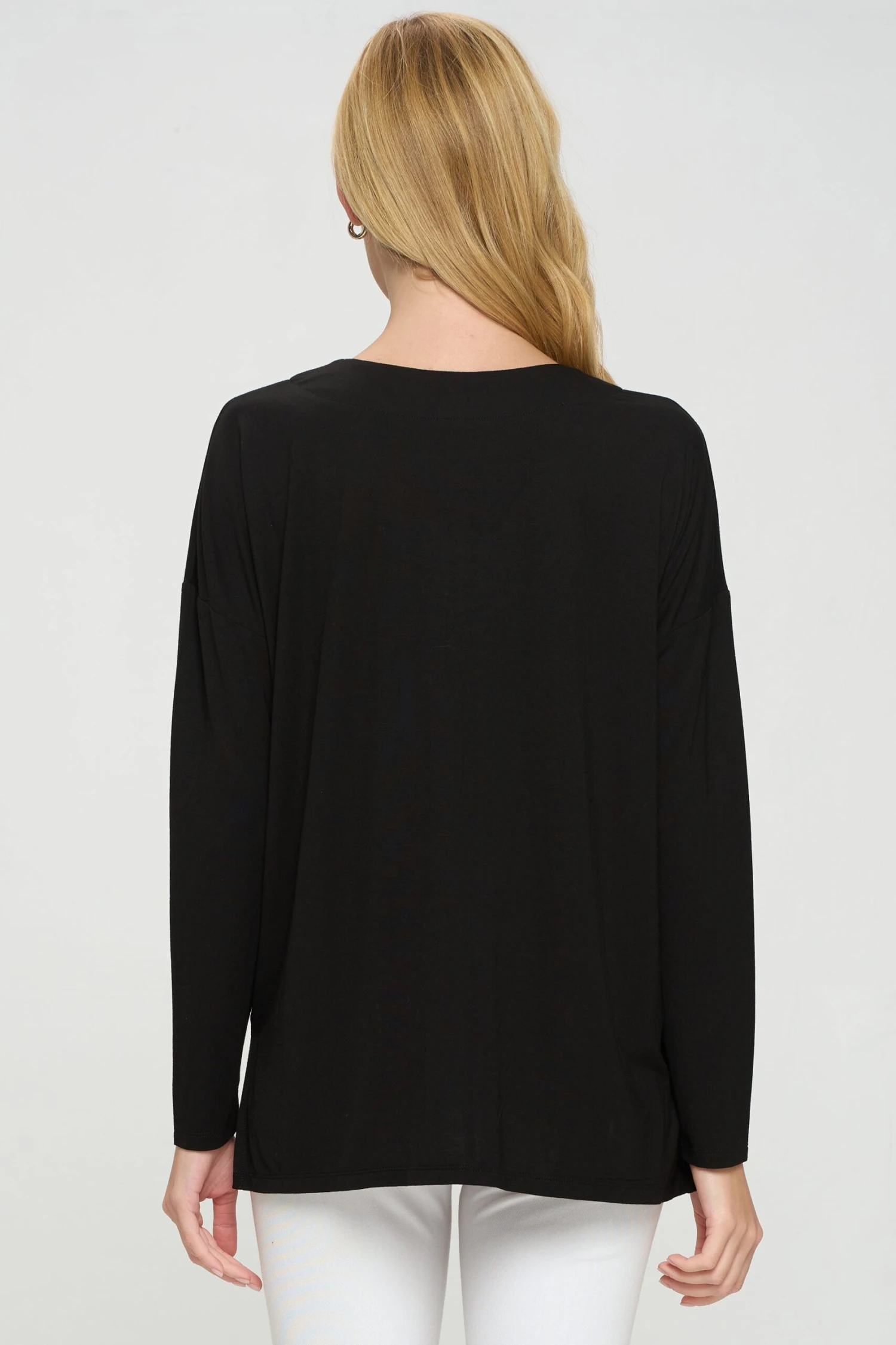 Lightweight and always flattering, this basic V-neck long sleeve top is a closet necessity. Dress it up with a cardigan or wear it by itself. You’ll keep going back to wear this ultra-soft essential.