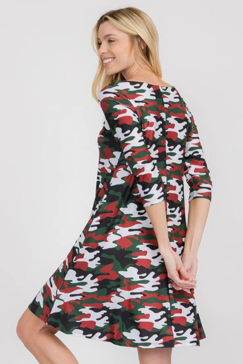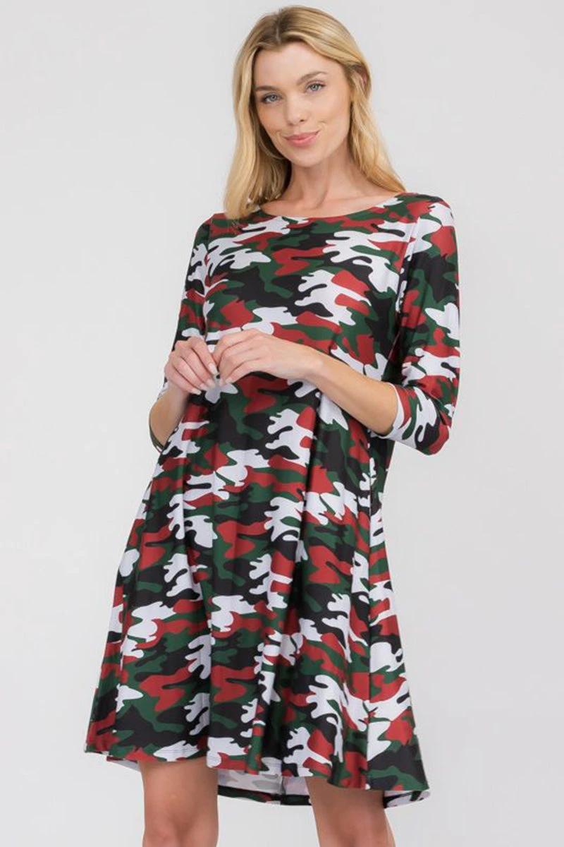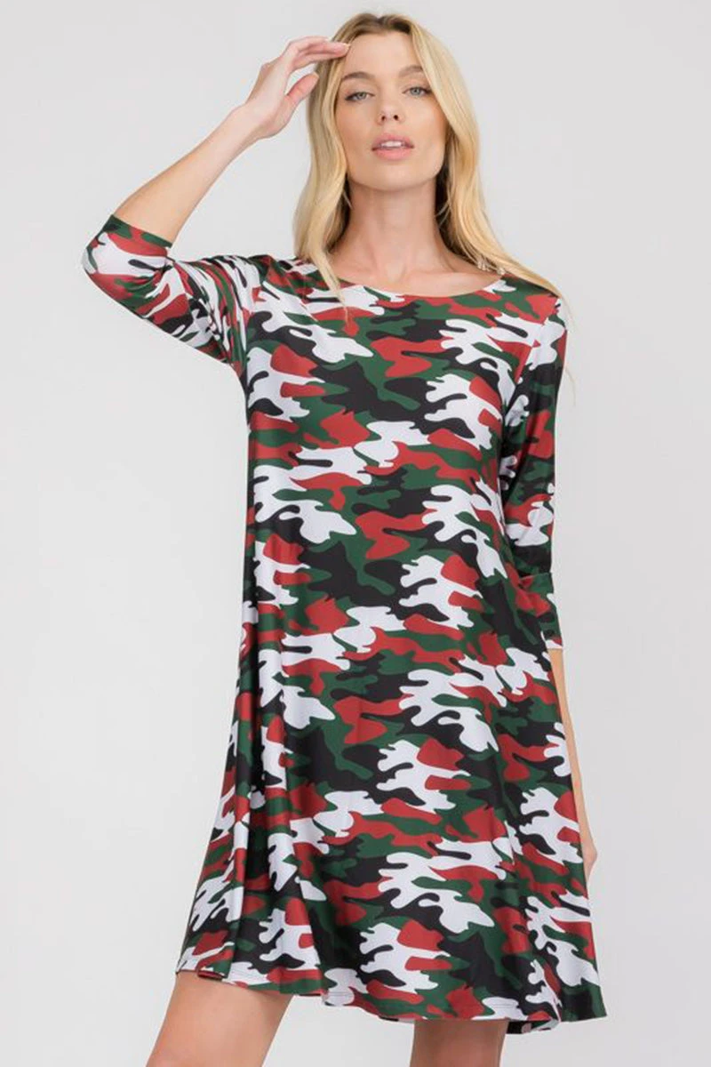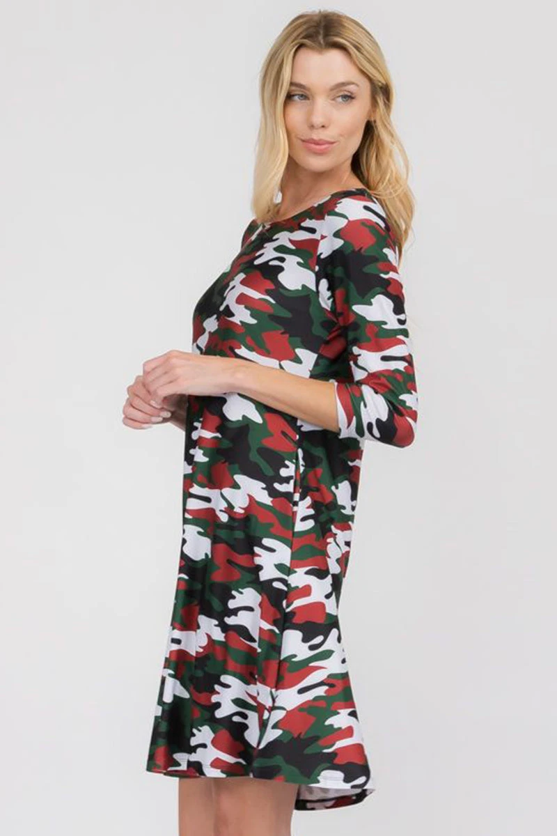 This trendy camouflage dress features ¾ sleeves, soft knit fabric and two pockets on each hip.