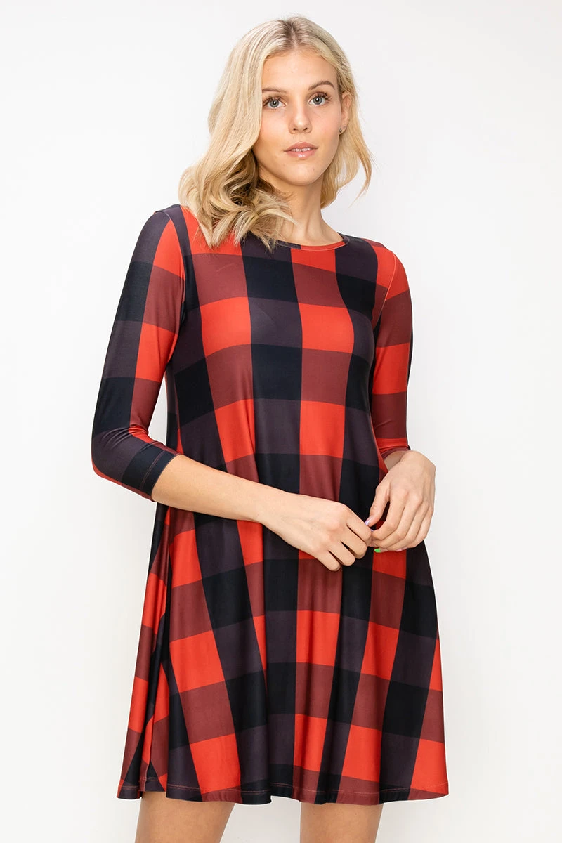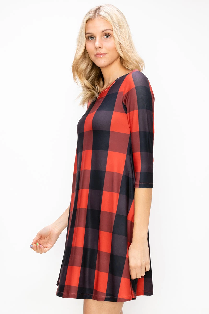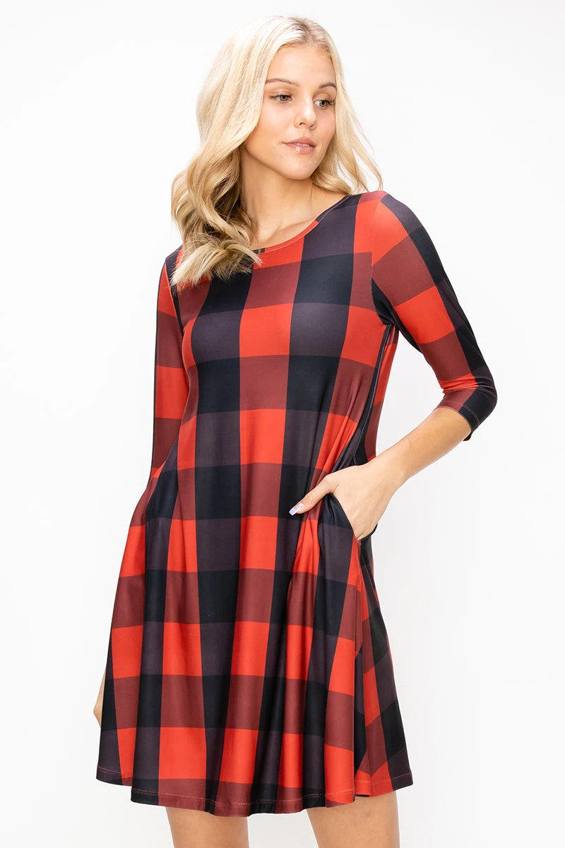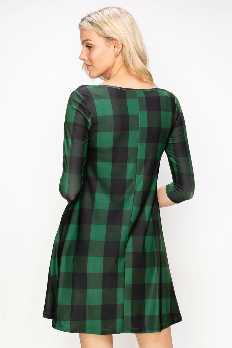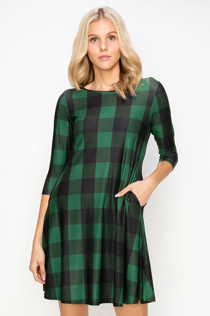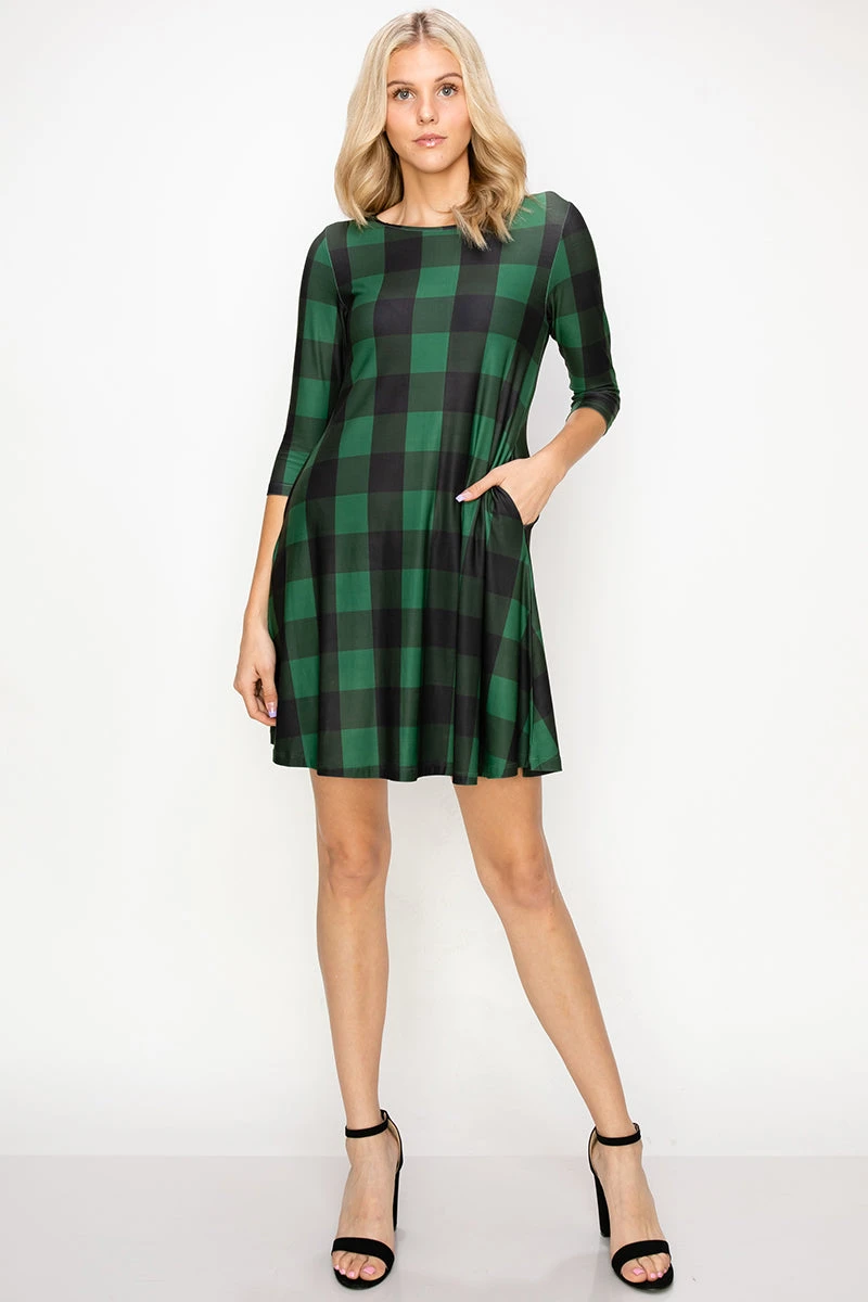 Get that trendy, chic style instantly with this checkered print A-line dress featuring 3/4 sleeves, two pockets, and flowy silhouette that pairs great with sheer tights!