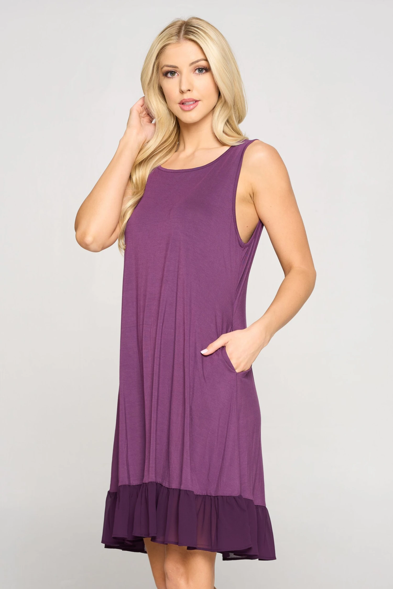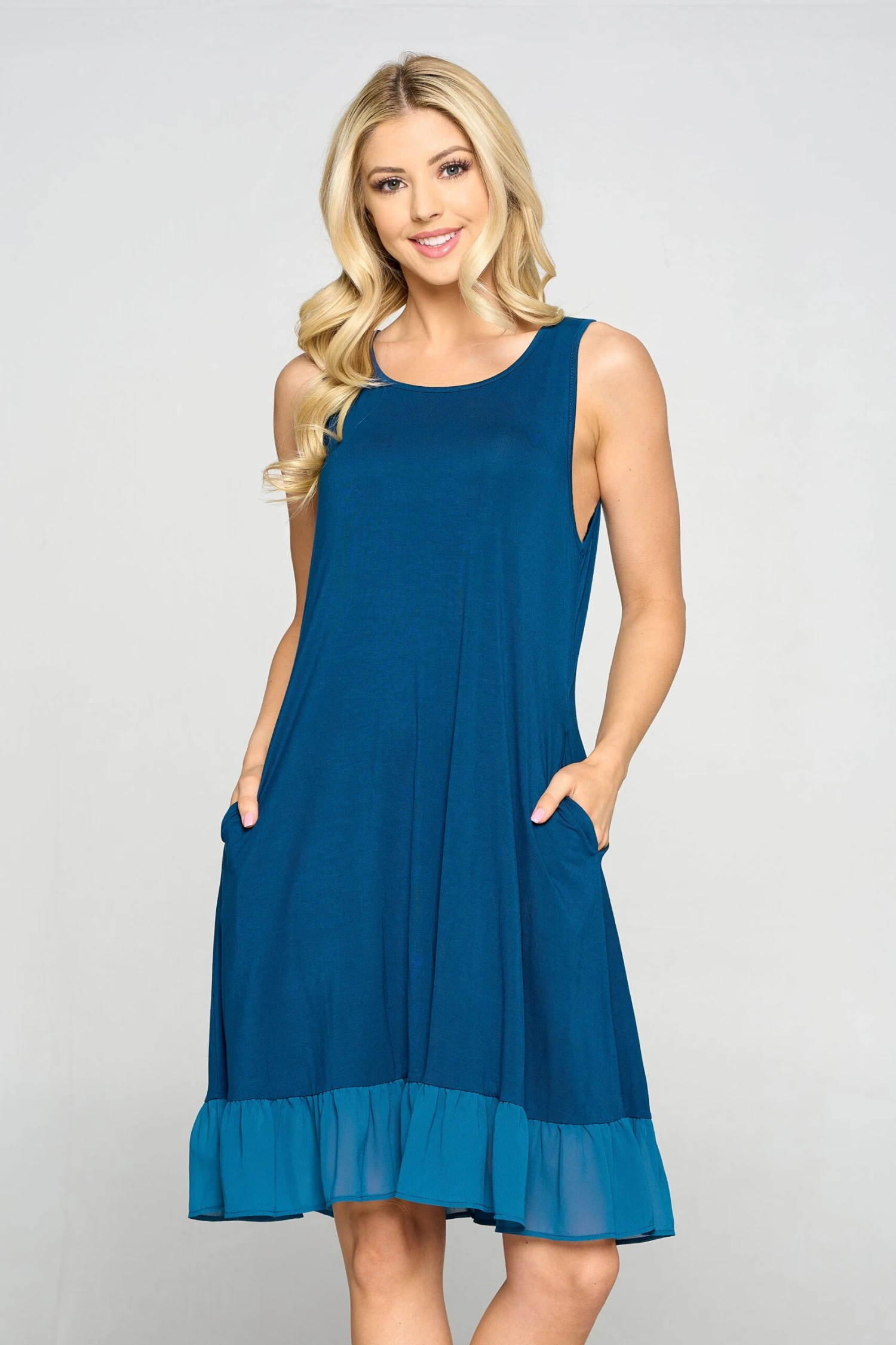 Go ahead and give yourself a twirl! This flowy tank dress features an A-line silhouette, a sleeveless design, two pockets on each hip, and a chic chiffon ruffle hem that adds a little extra flare to this classy dress.