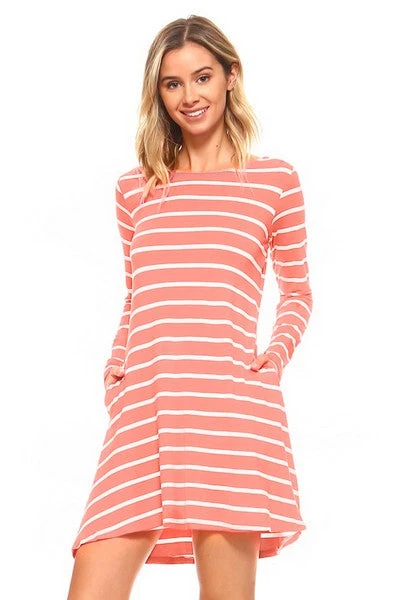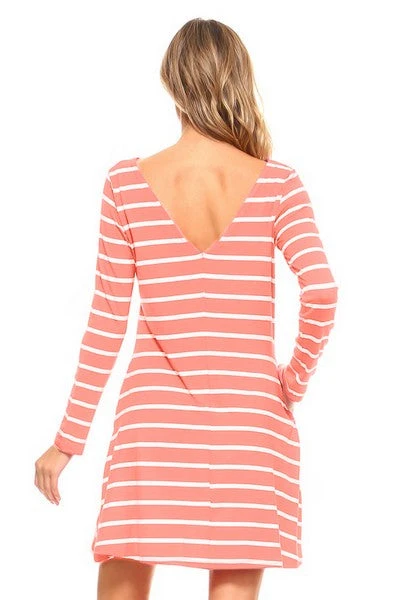 This long sleeve stripe dress with V-drop on the back packs chic and versatile style into one very cute dress…and did we mention it has pockets? Achieve the perfect casual and trendy look wearing this dress to your next hangout with friends.Â