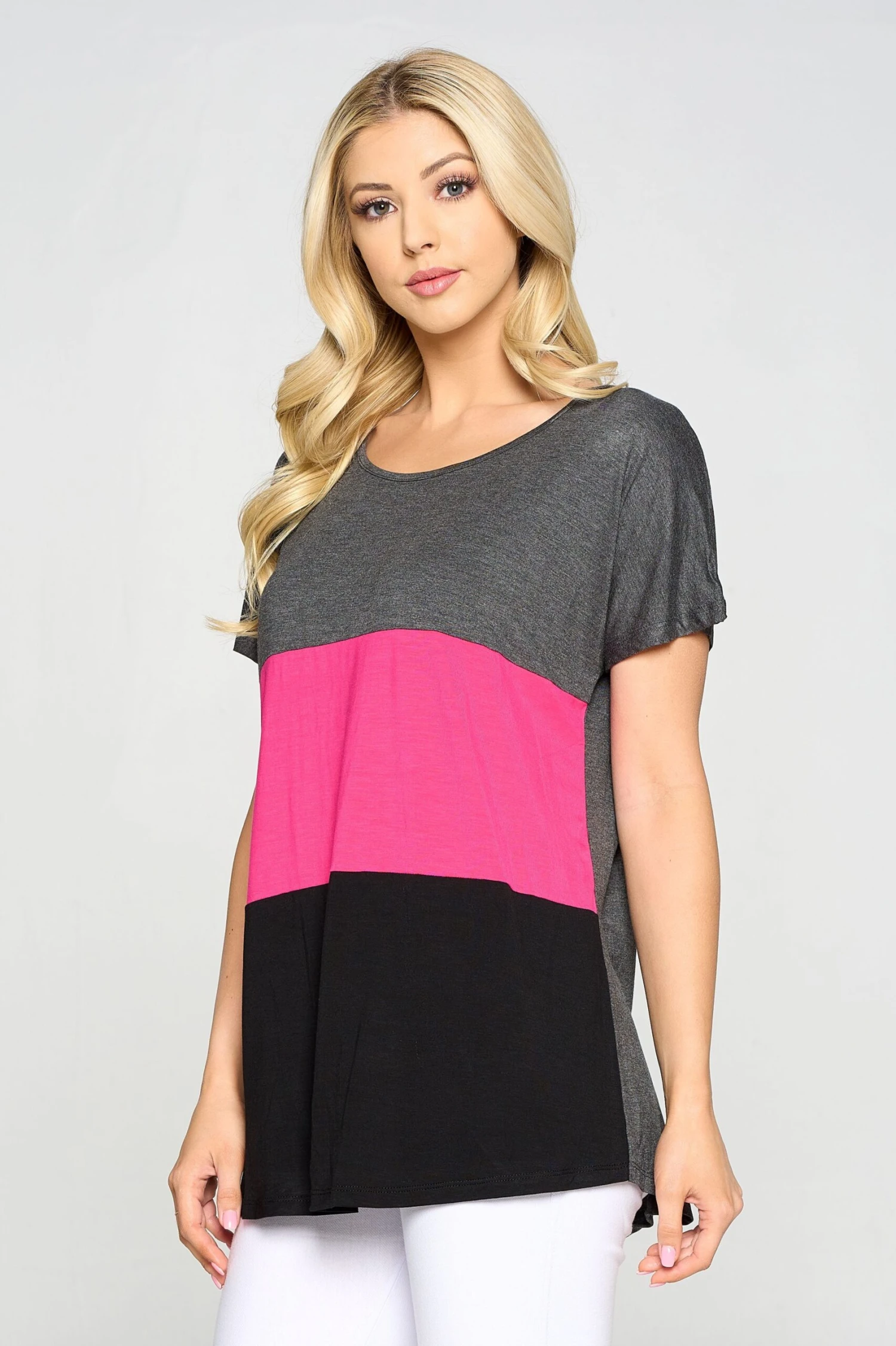 Featuring a trendy colorblock detail, this short sleeve top is constructed with soft, stretchy knit material that is flowy, breathable and is calling your name! Get this chic style in 3 different color variations.Â