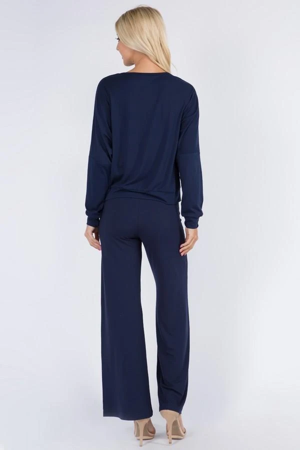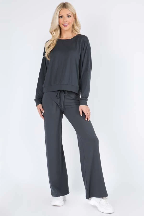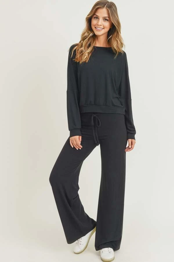 We’ve got you covered this stay-at-home season! Our Comfy 2 Piece Loungewear Set is constructed with ultra-soft knit material. Our long sleeve top has a round neckline and cuffed hem. The matching drawstring pants have a high-rise waistline and a wide leg silhouette.