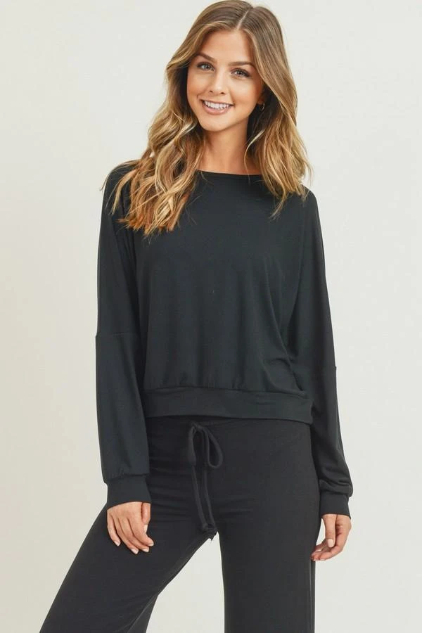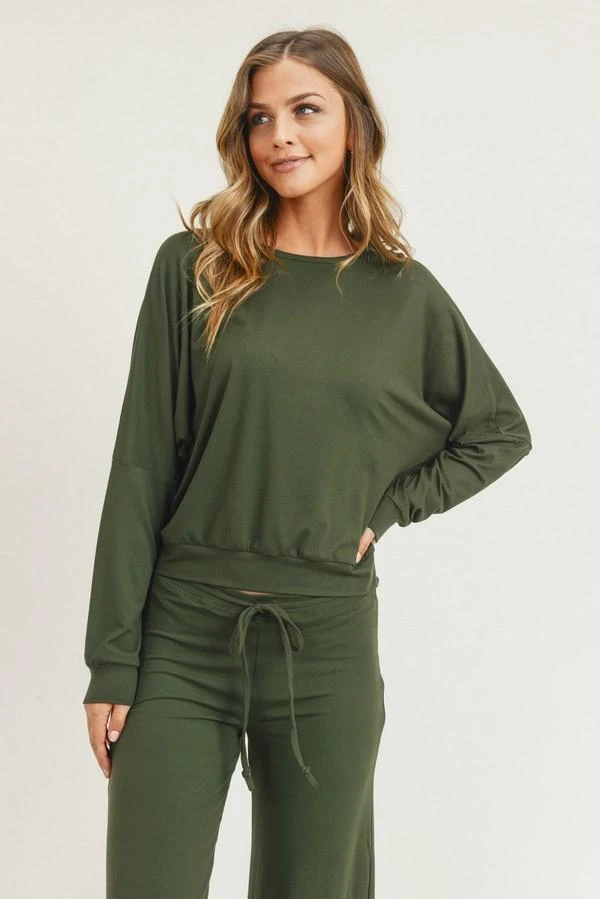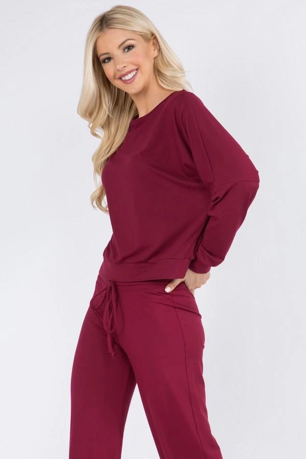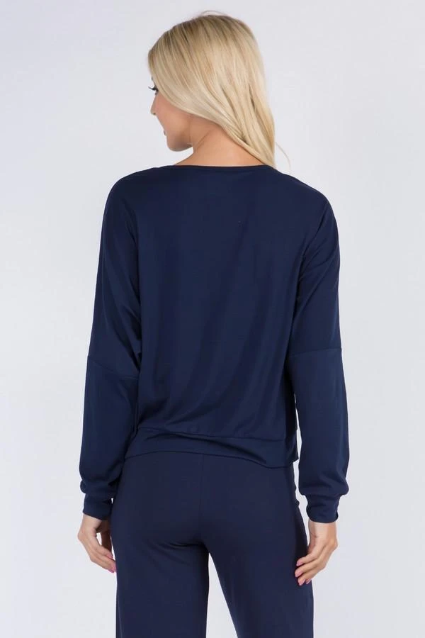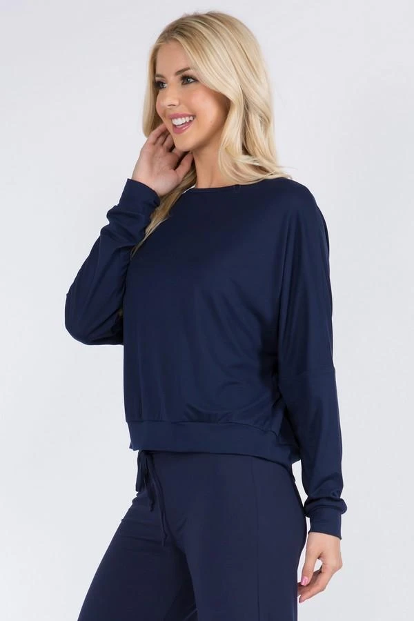 We’ve got you covered this stay-at-home season! Our long sleeve loungewear top is constructed with ultra-soft knit material and has a dropped shoulder seam, banded cuffs and has a crewneck neckline.