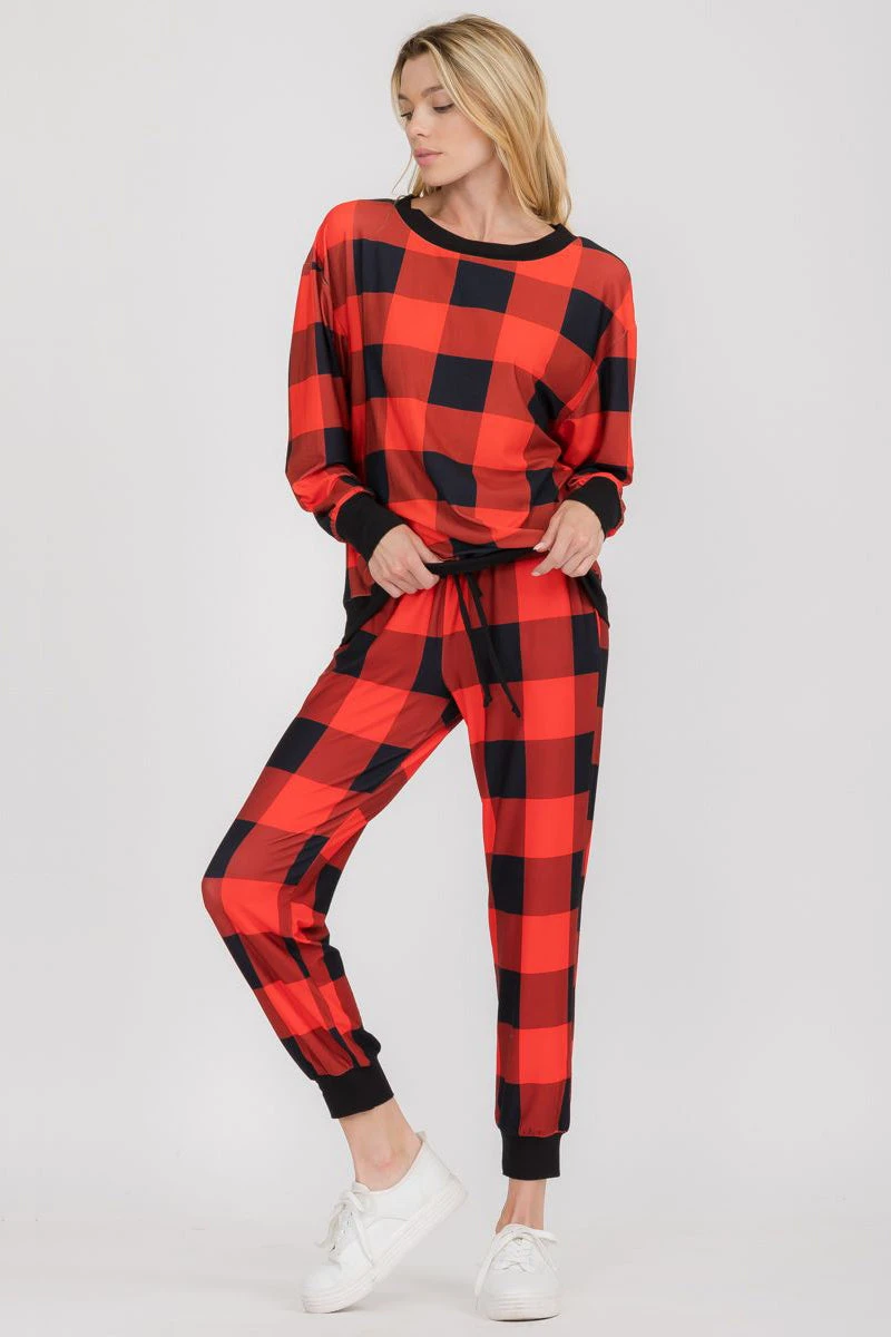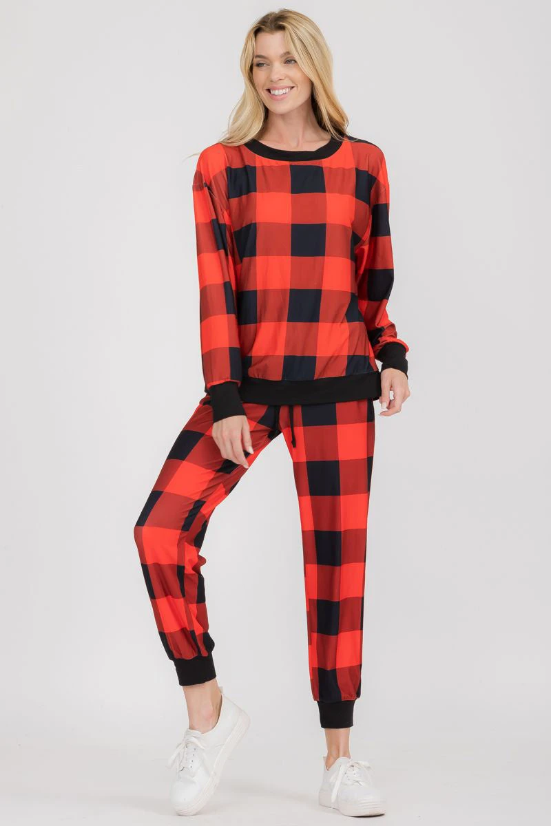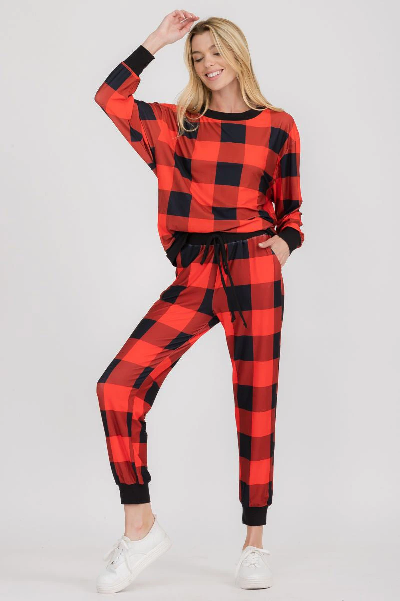 Get curled up and cozy in this matching two-piece loungewear set! Featuring red and black buffalo print that’s lightweight, soft and oh-so cozy; all printed on this long sleeve crewneck and matching pair of high-rise joggers.