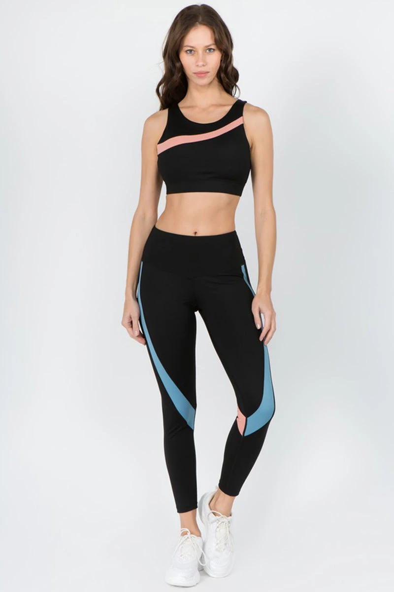 The perfect set for your next spin class! Keep yourself motivated wearing this striped two piece active set with its sporty design printed throughout the high neckline sports bra and matching leggings.