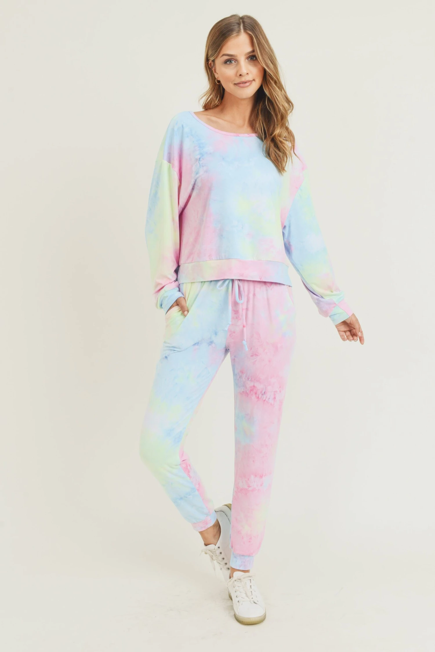 This dreamy tie-dye loungewear set is perfect for your online meetings, running errands, or even just chillin around the house! You’ll be daydreaming in this comfy fit no matter the occasion.Â