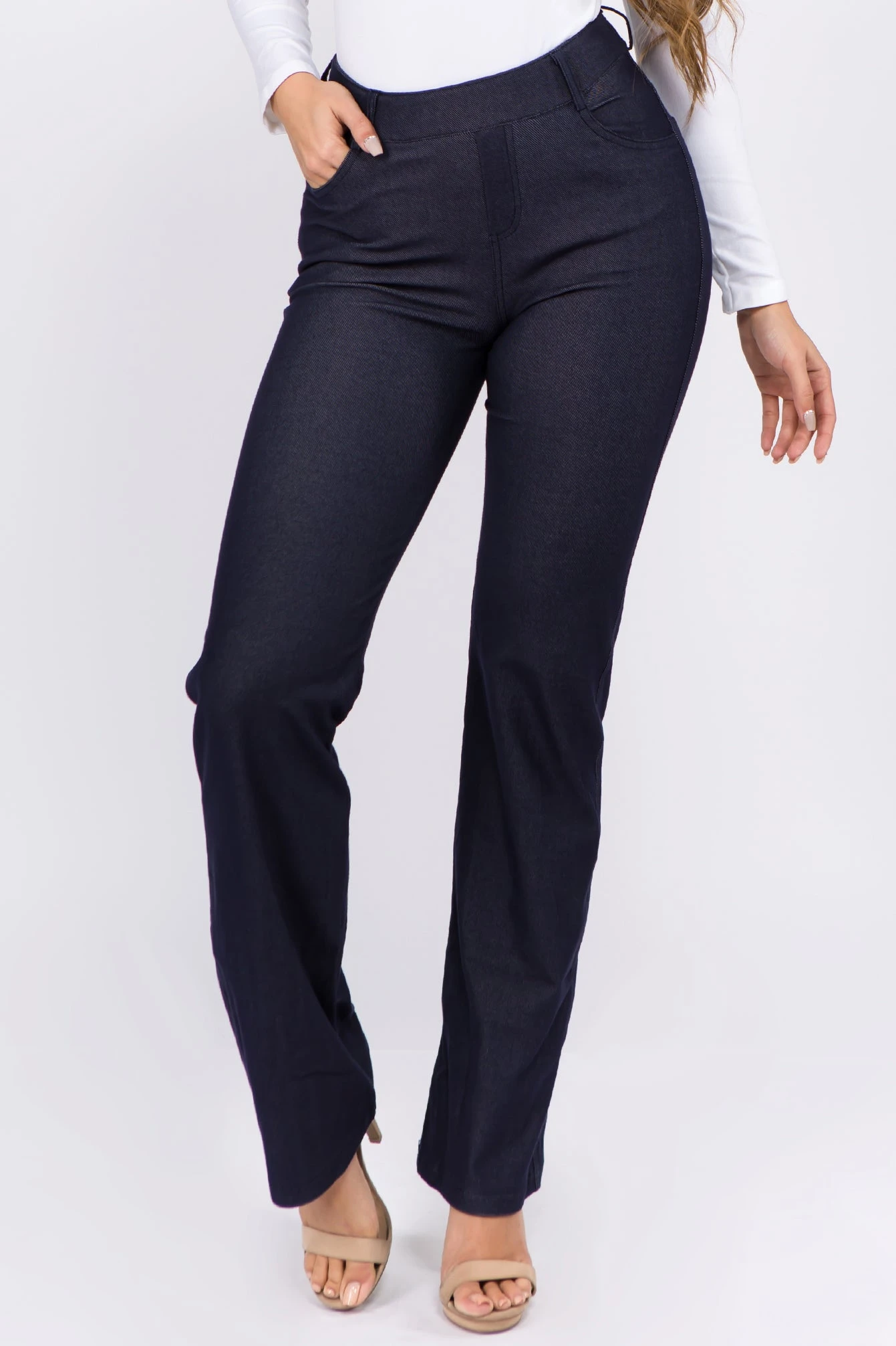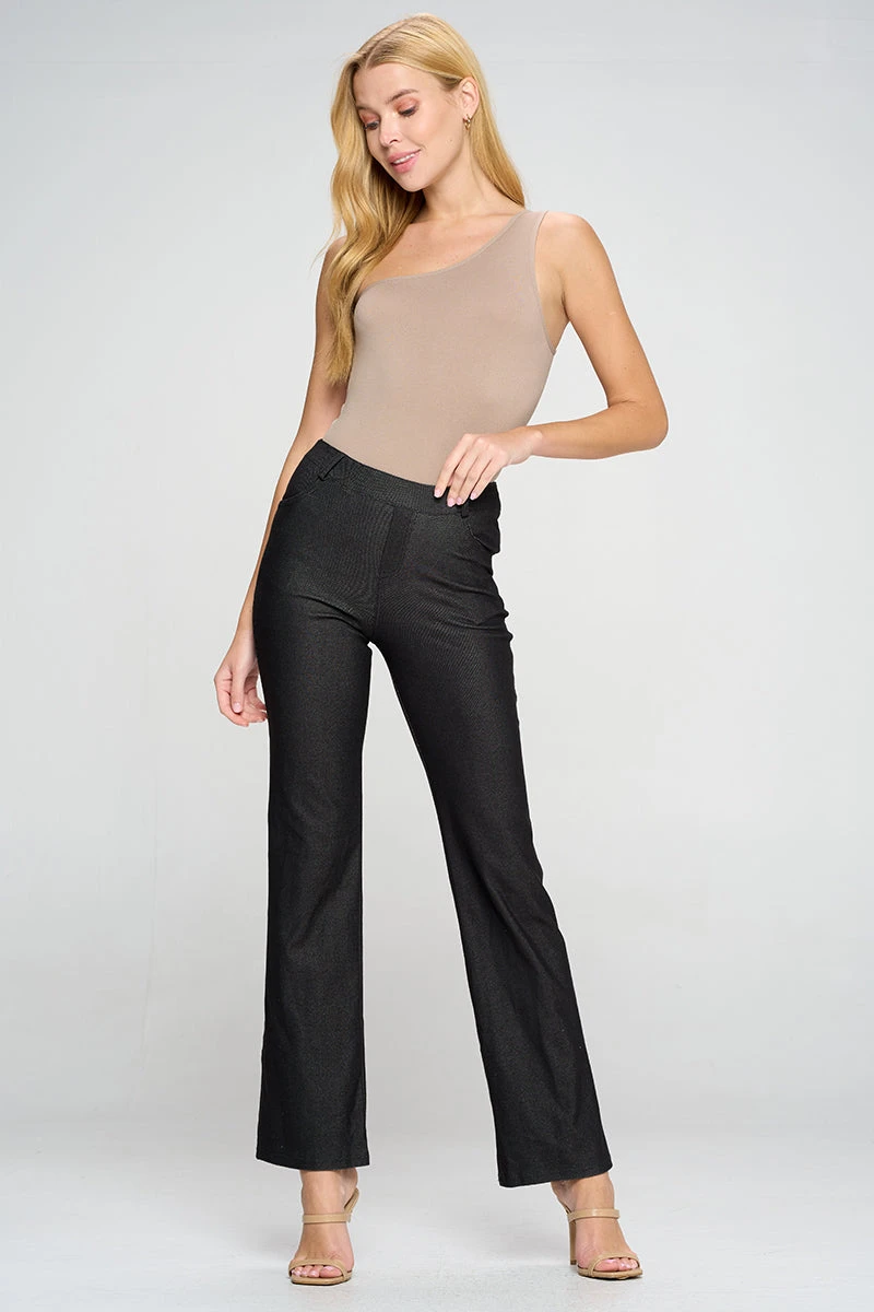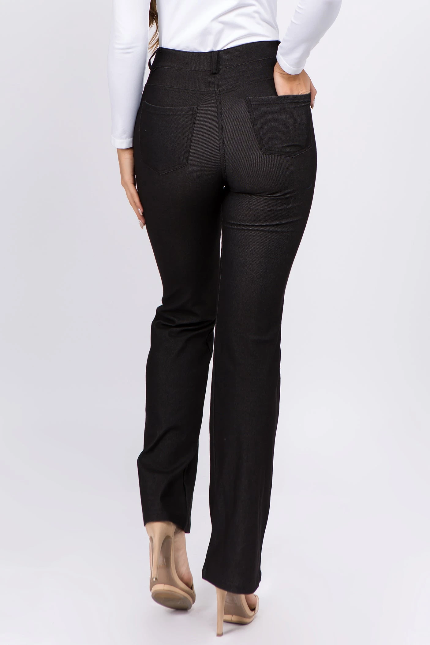 - Stretchy denim twill fabrication resembles jean material