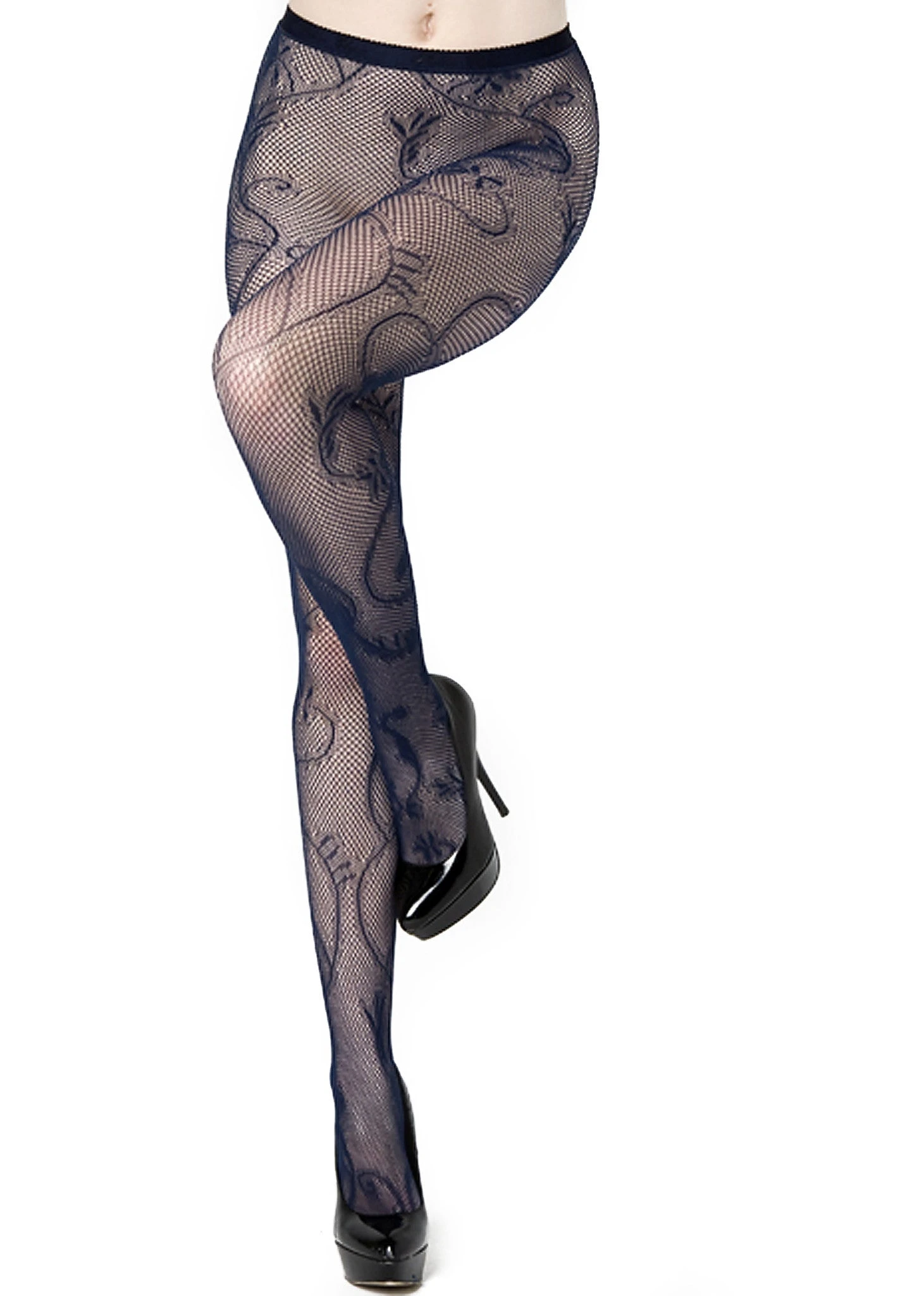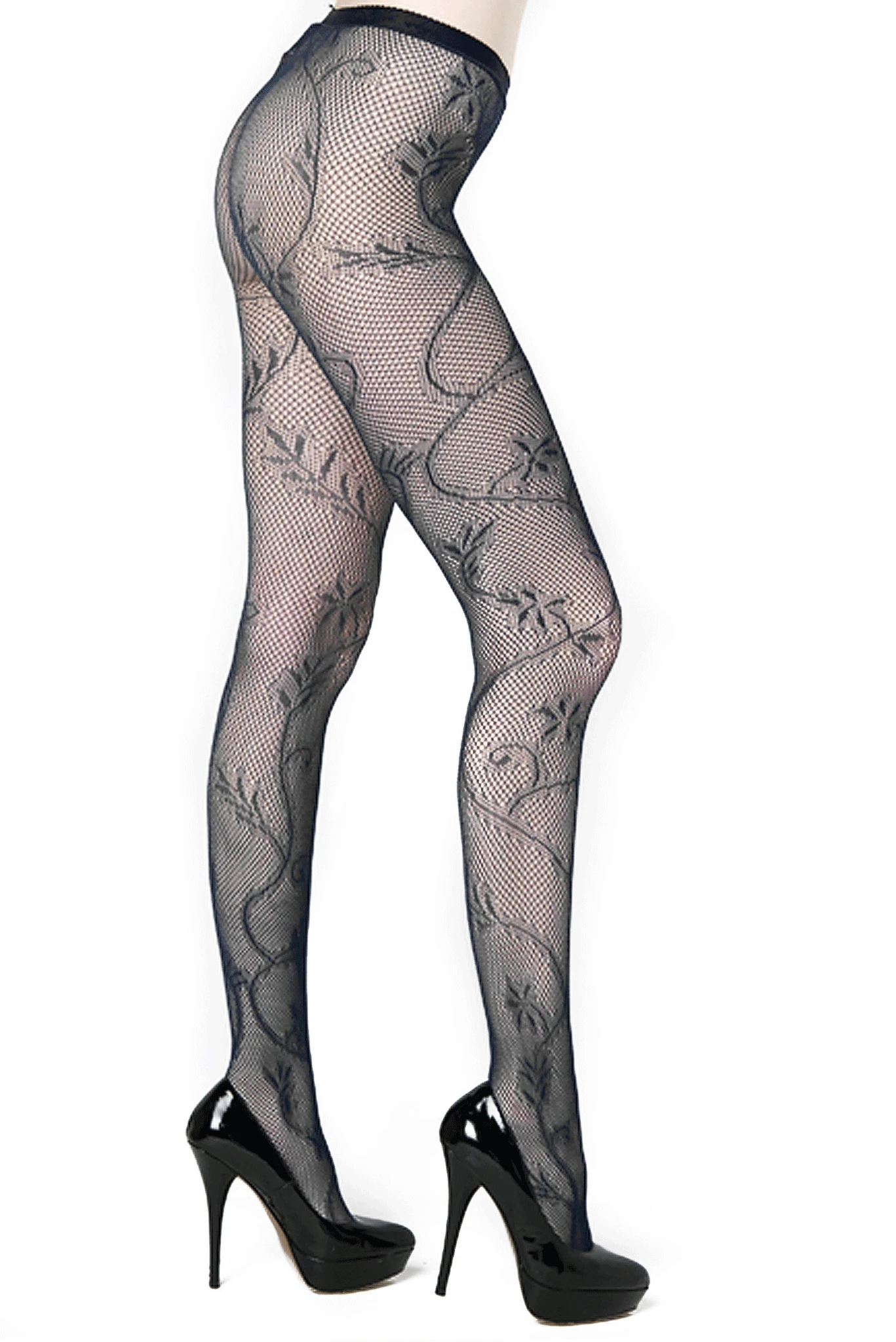 Floral stitching wraps around the leg of these colored fishnet pantyhose from elastic waistband to toe. Available in regular and plus size. Reinforced toe and cotton gusset for additional support. Pick your favorite style to keep warm and stylish all Winter long!