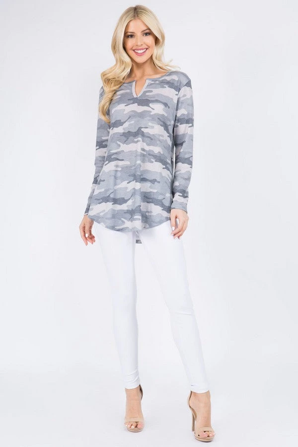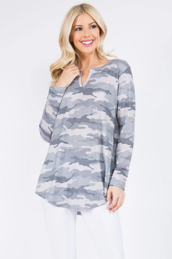 We love comfortable fashion here and this long sleeve tunic ladies, is a winner! Our camo print tunic top features a slit notch on the neckline, a flattering scoop hem and is constructed with soft cotton fabric that has a stretch too. We’re obsessed!
