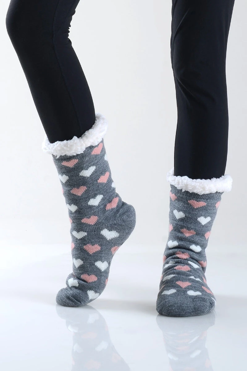 Add these faux sherpa double layered, thermal slipper socks to your bag next trip to the mountains. You’ll fall in love with these heart shapes printed socks.