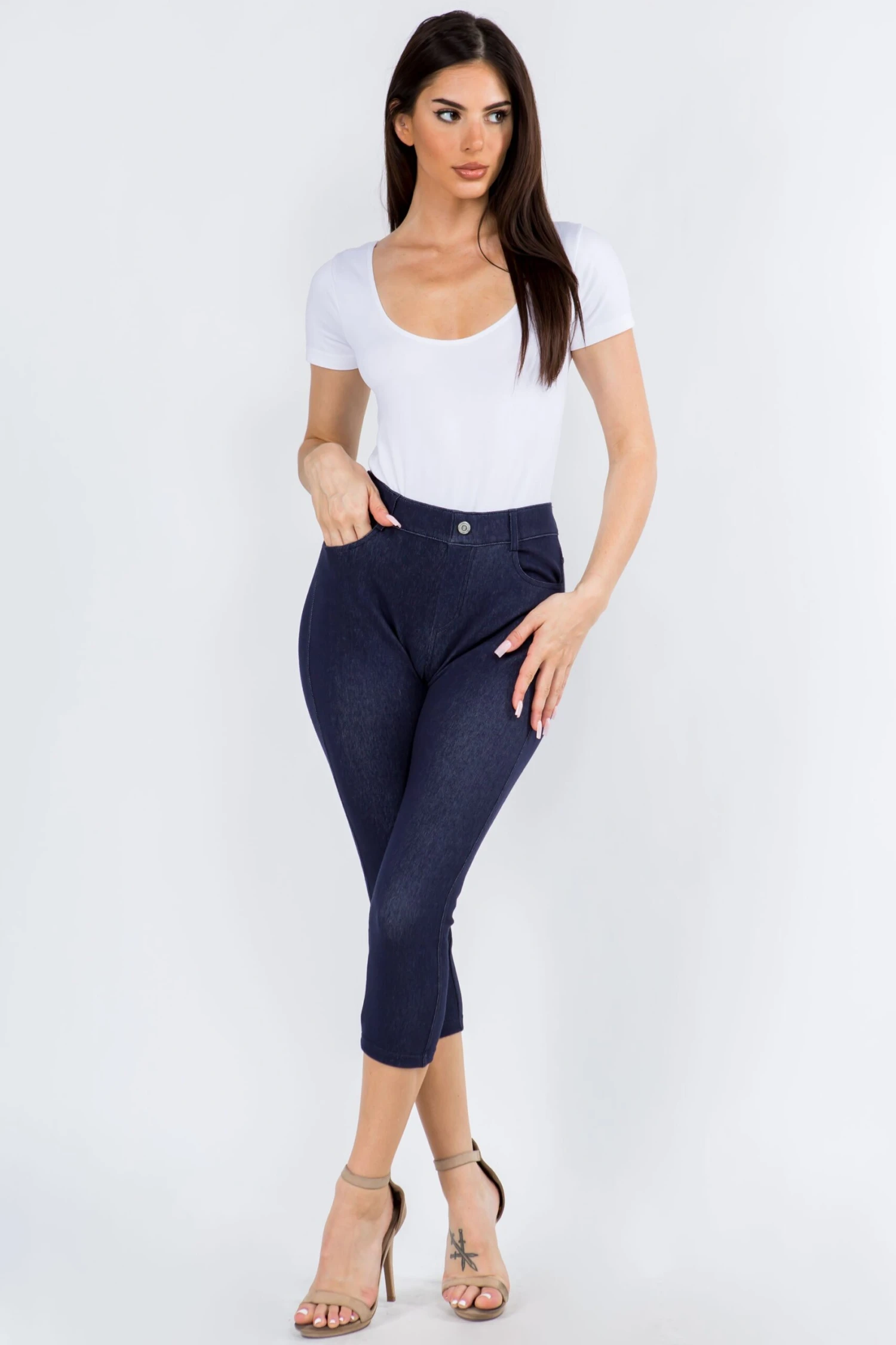 These skinny capri jeggings will become a staple in your closet thanks to the soft, snug fit, and faded accents that resemble your favorite pair of denim.. minus the zipper and buttons!