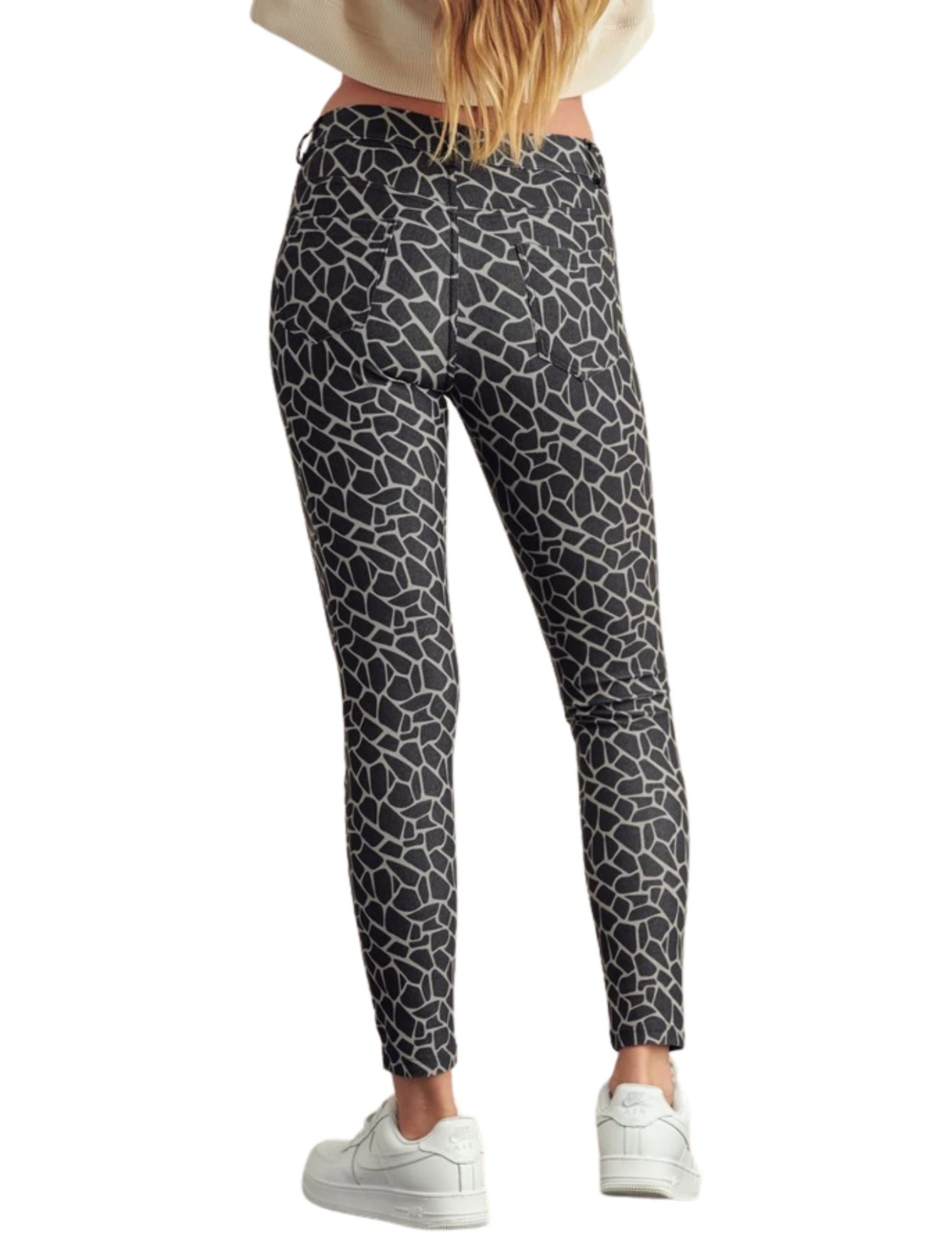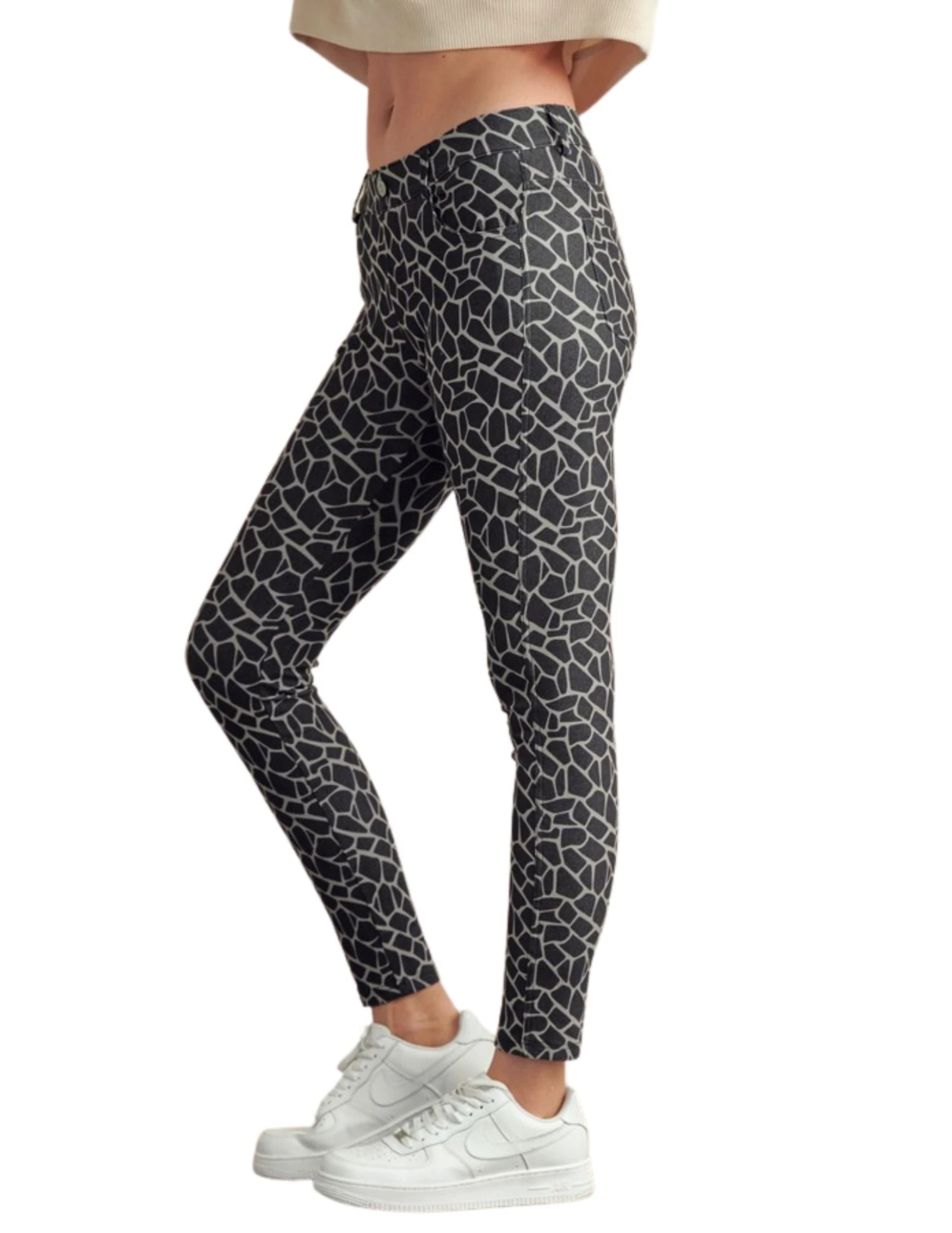 Make a statement in leopard print jeggings! Our skinny leg jeggings feature a faux zipper panel and faux shake head button.. That’s right. No zipping these bad boys up, or closing them! Our snake print jeggings are pull up style, and feature belt loops and functioning pockets, making these stretchy cotton-blend bottoms a win!Â