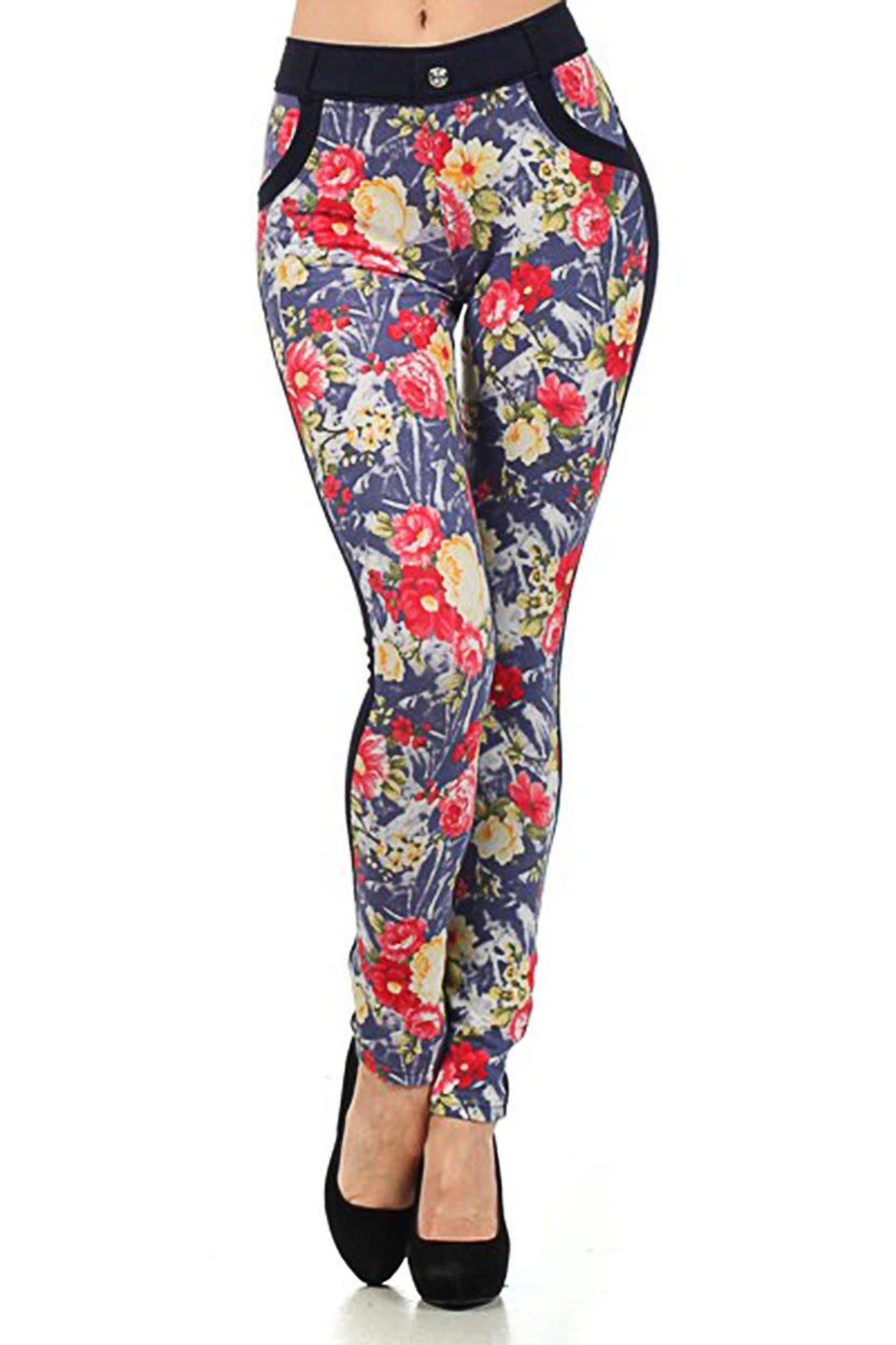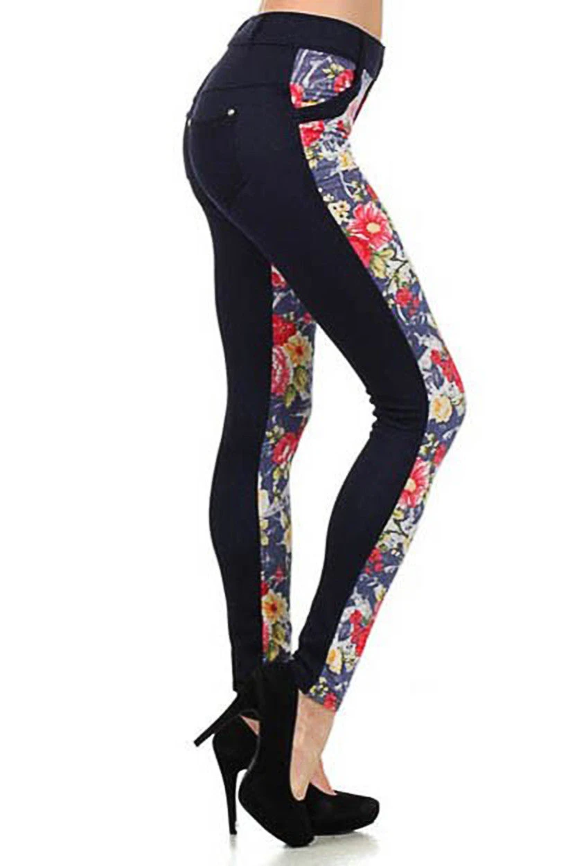 Soak up the last of the Summer sun. Turn up and tune-in to the Liza two-tone jean leggings with floral print. Features belt loops and 4 pocket construction. The Liza has a low-rise with subtle rhinestone embellishments on the front and back pockets. Blend in with the seasons and stand out in the rising sun.