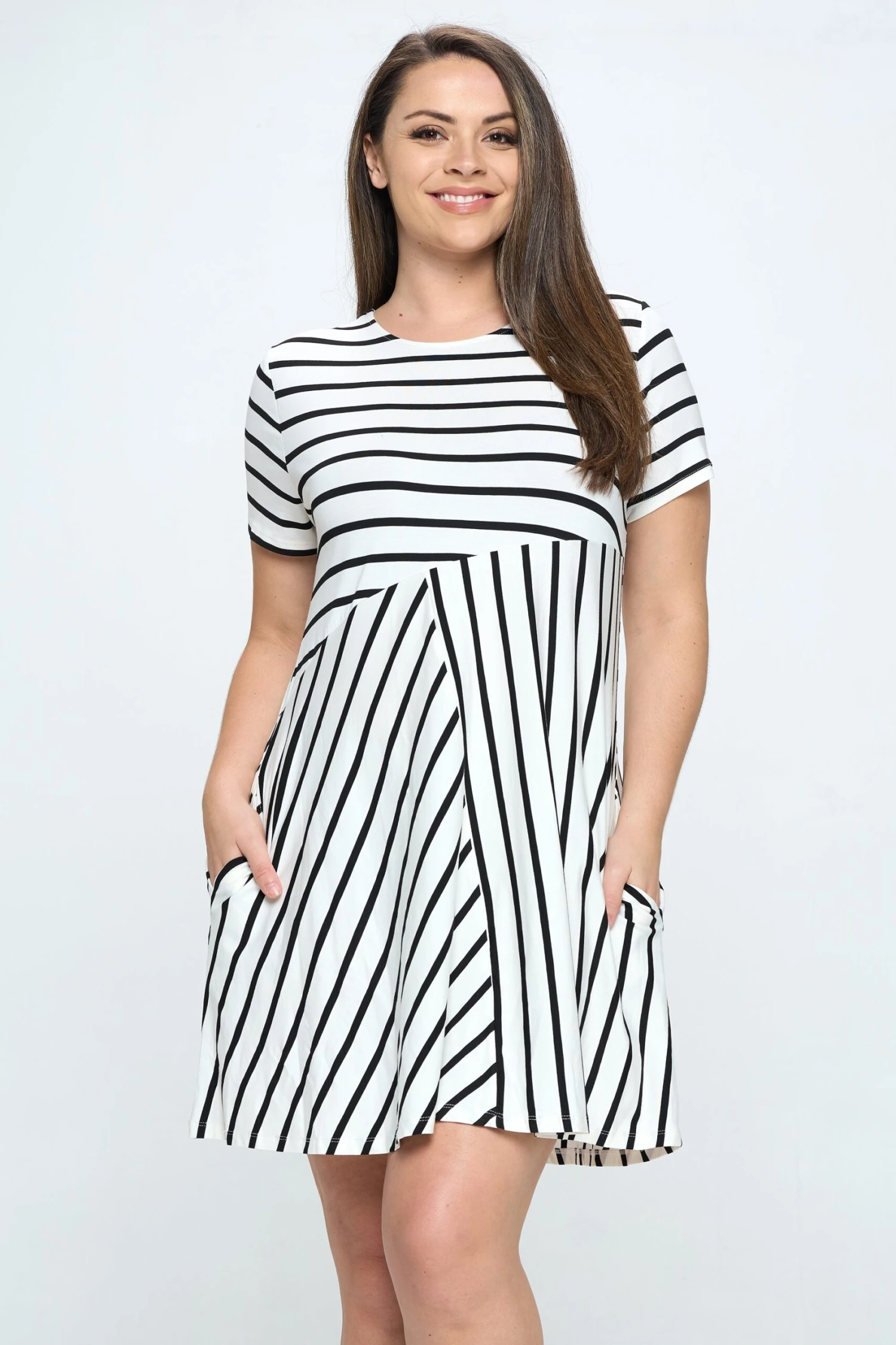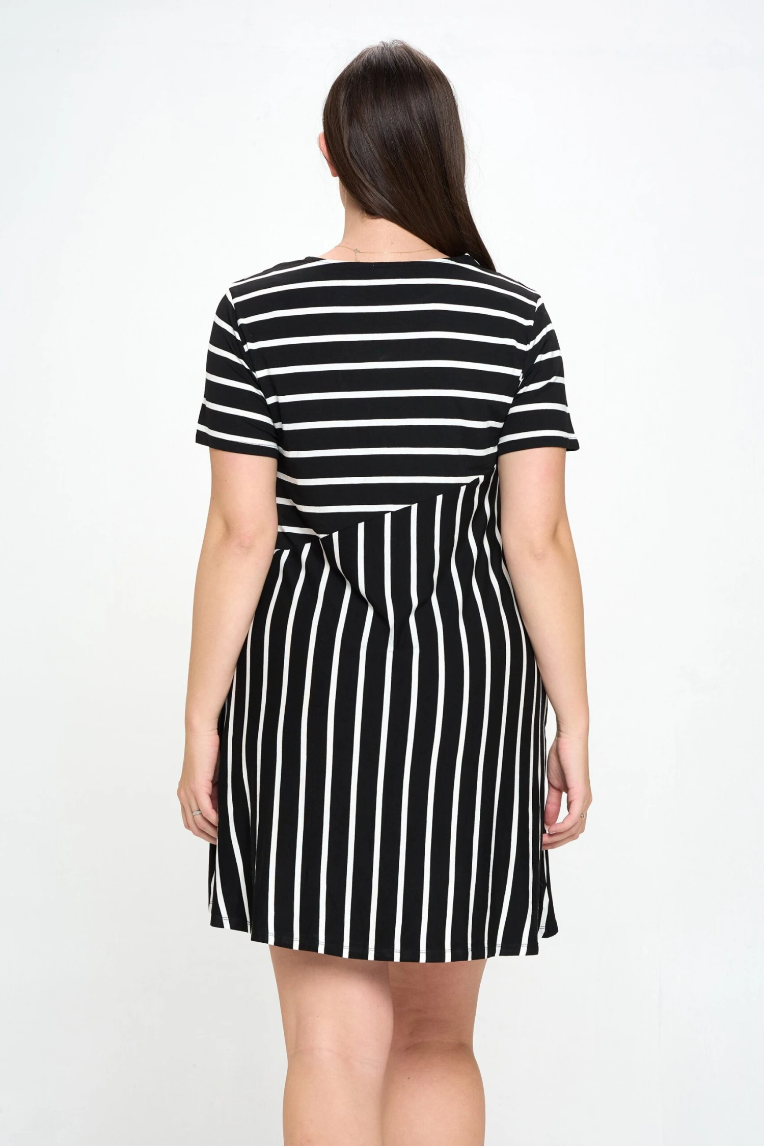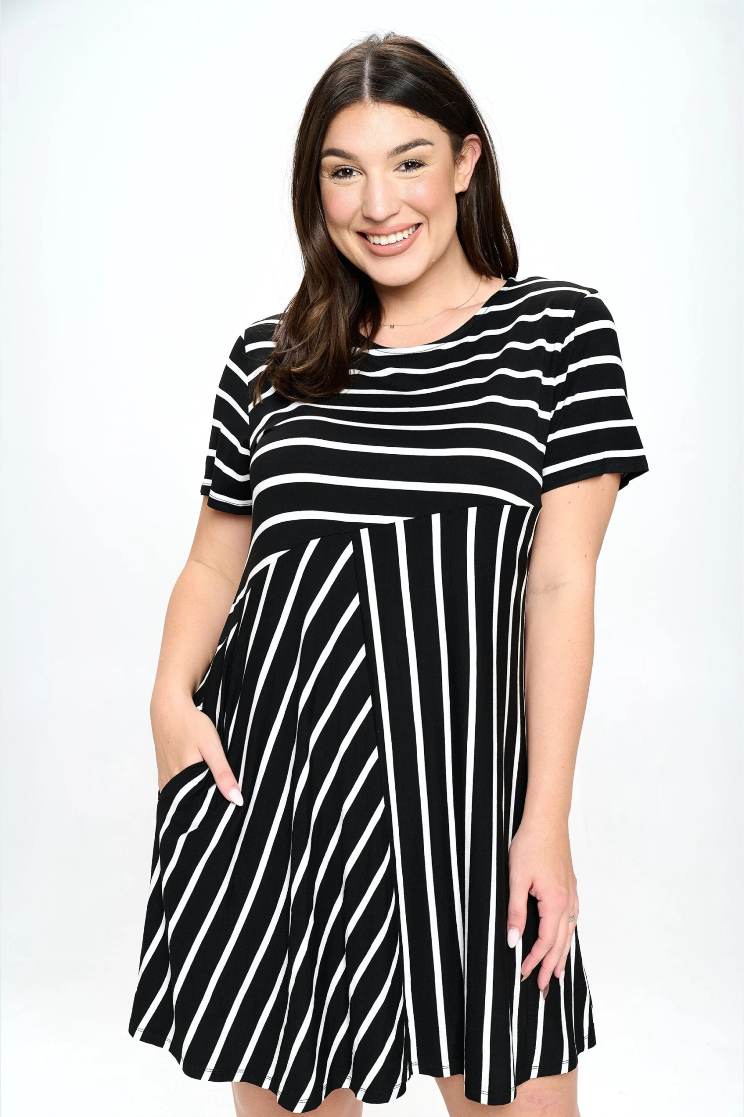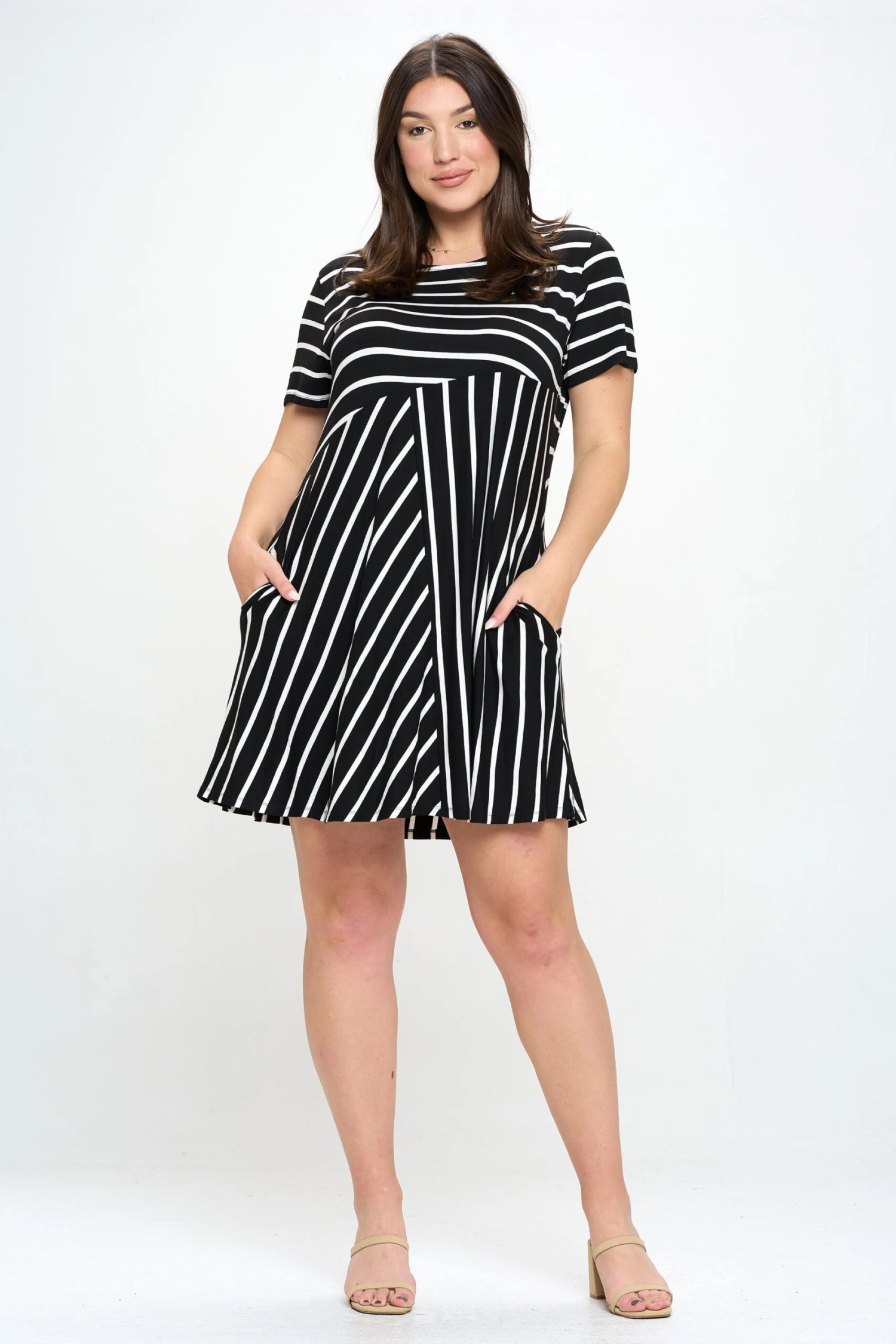 Look in a new direction in this multidirectional lined dress! Bold vertical and horizontal stripes over solid color provide depth and contrast.