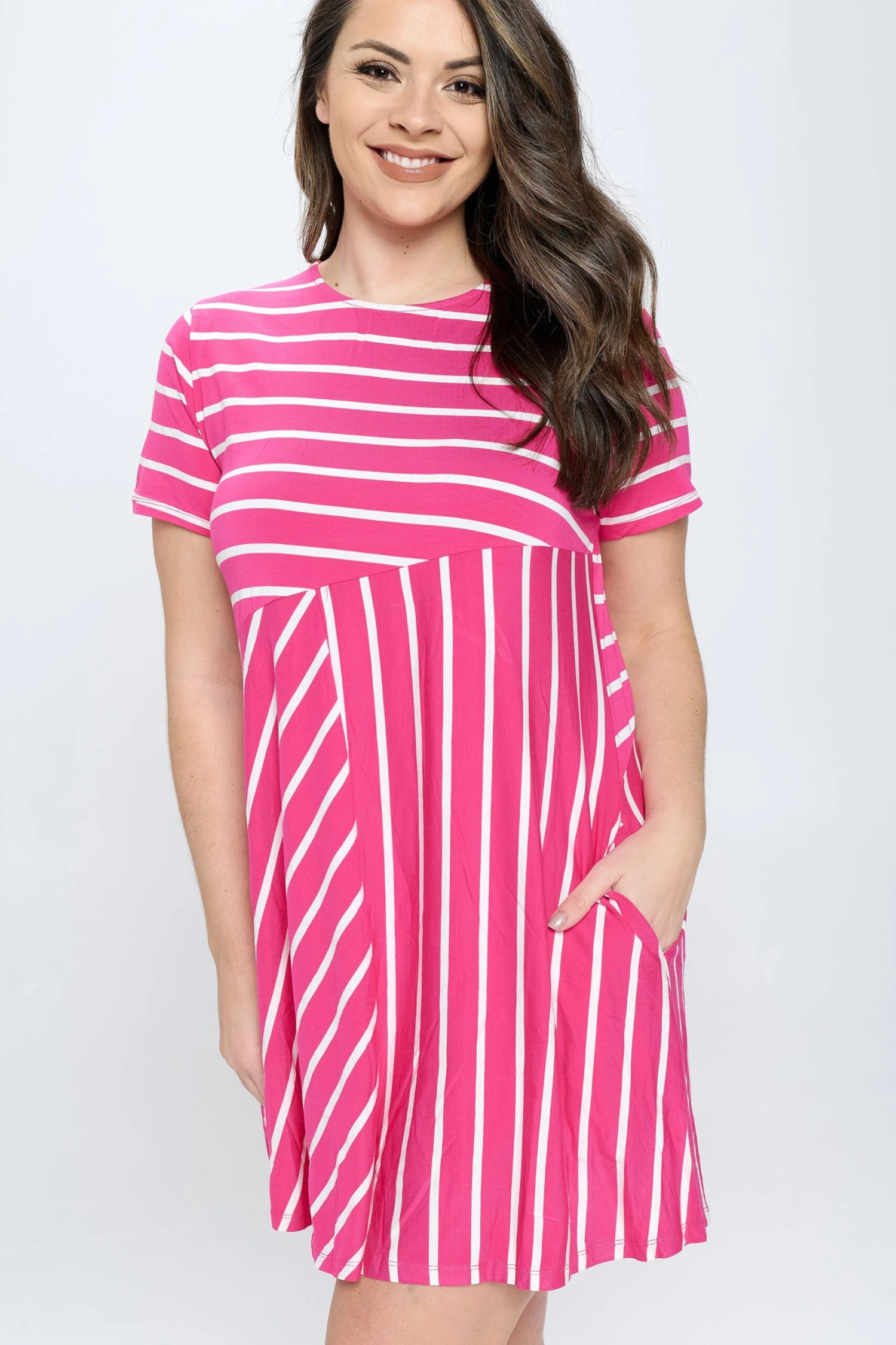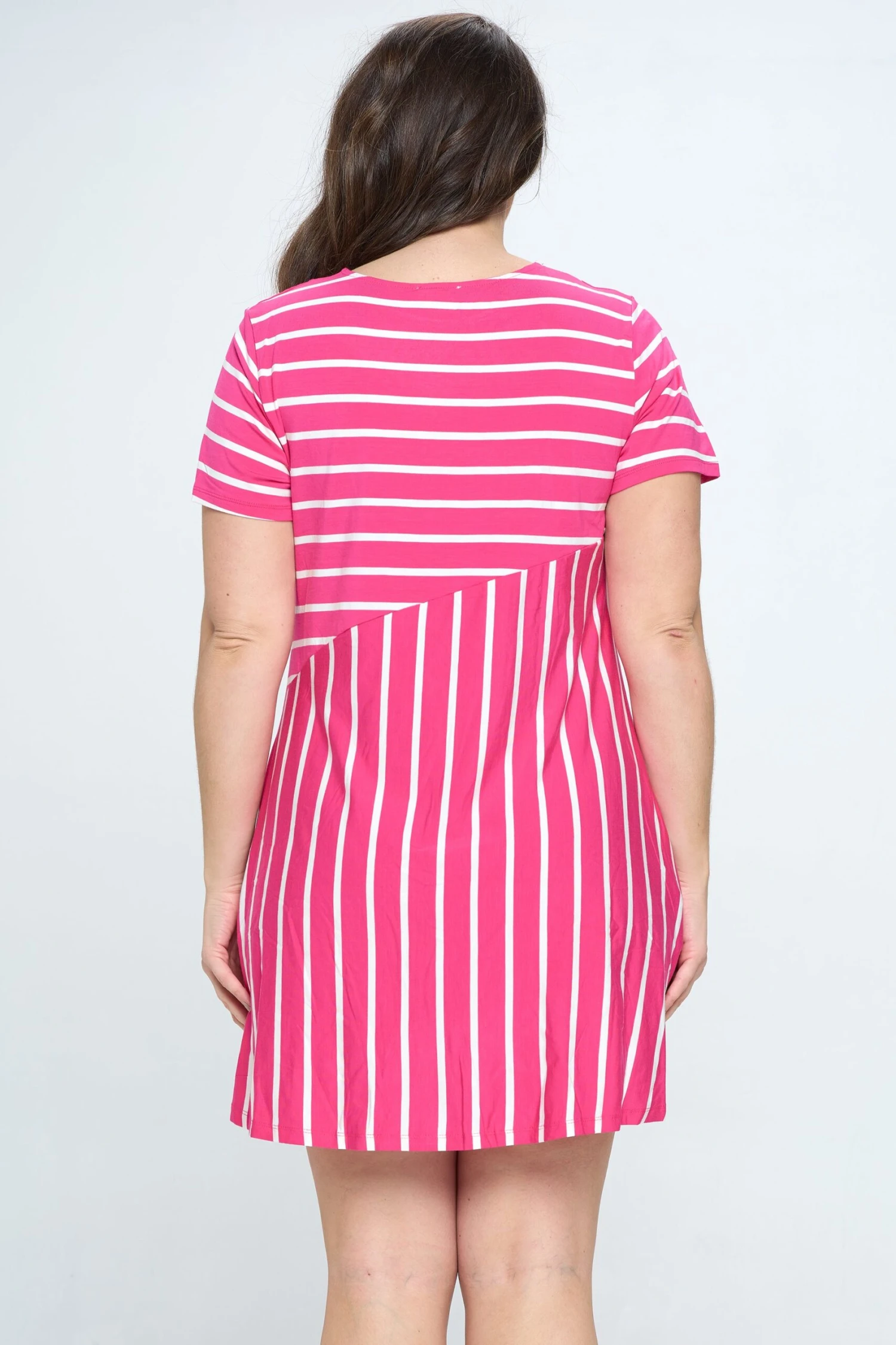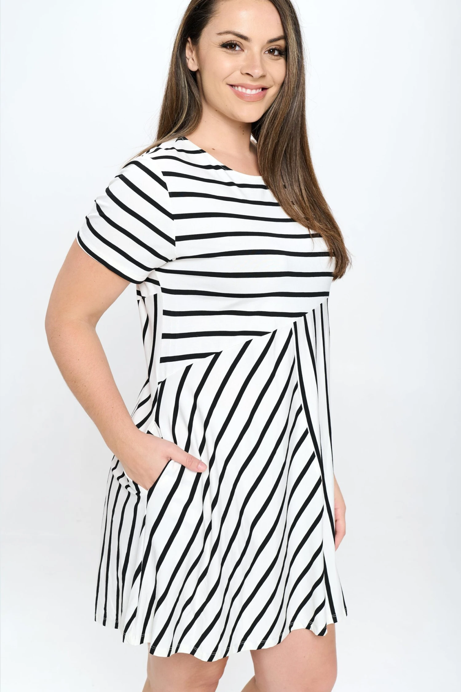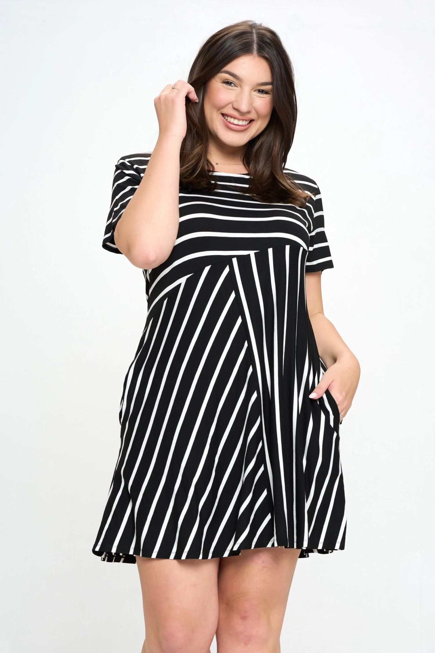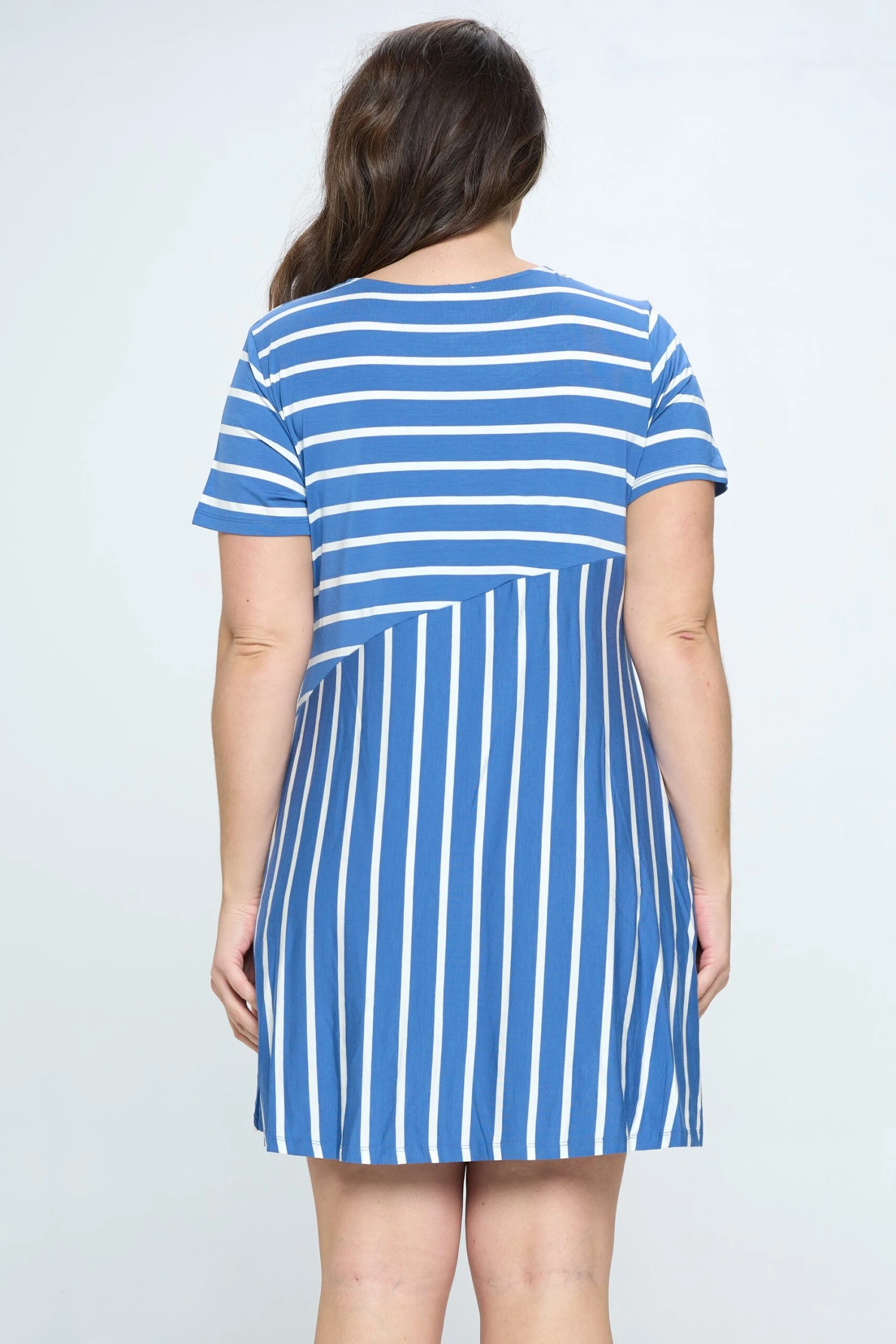 Look in a new direction in this multidirectional lined dress! Bold vertical and horizontal stripes over solid color provide depth and contrast.