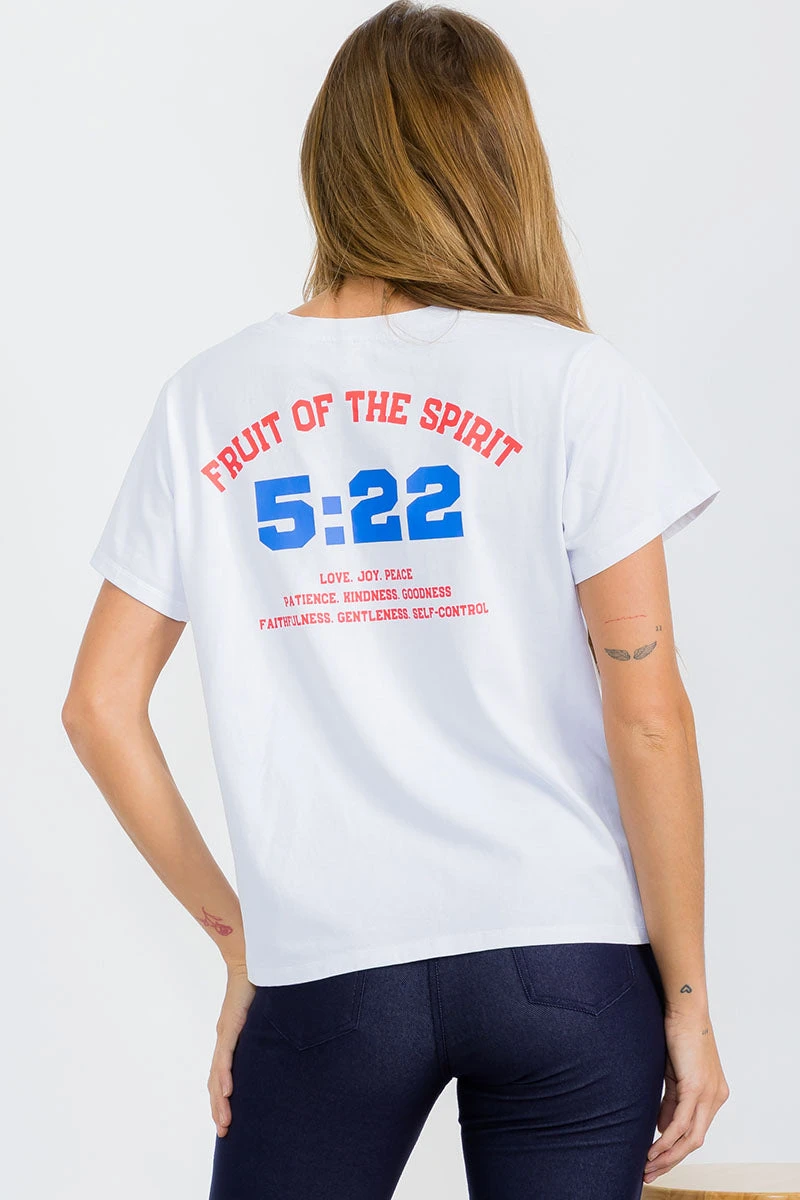 - Back – “FRUIT OF THE SPIRIT 5:22 Love. Joy. Peace. Patience. Kindness. Goodness. Faithfulness. Gentleness. Self-control.”