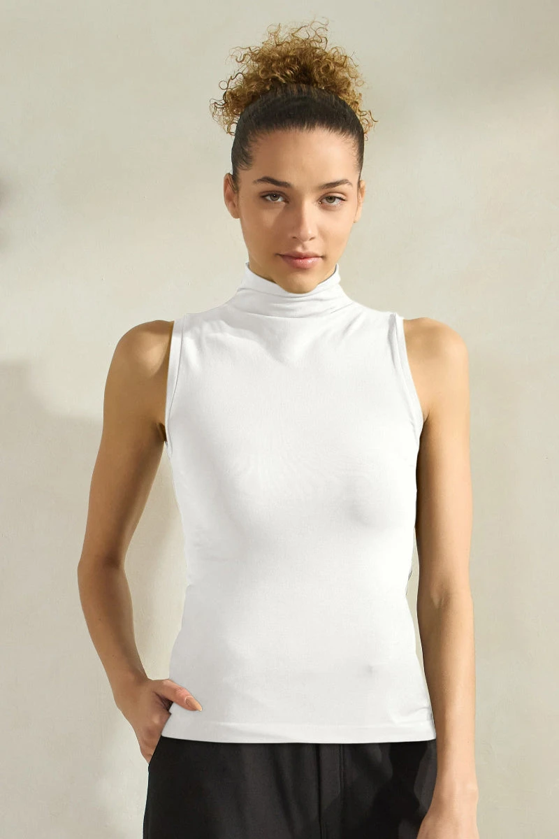 This seamless sleeveless shirt is crafted from breathable soft fabric and features mock turtle neck upper and open shoulders. The relaxed stretchable slim fit and lightweight feel, it’s perfect for effortless summer style. An essential for your wardrobe, this versatile top can be worn alone or layered, making it ideal for casual wear, work and business outfits, or even as active wear when working out at the gym.