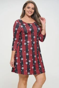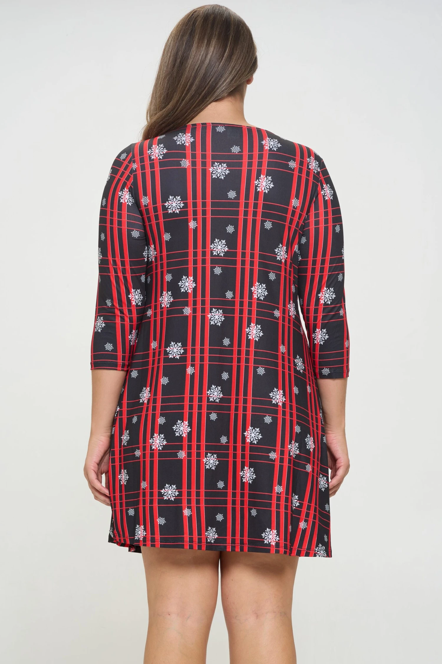 Lightweight and soft A-line dress, designed for the holiday season. Features 3/4 length sleeves, round neckline, and a classic plaid pattern.