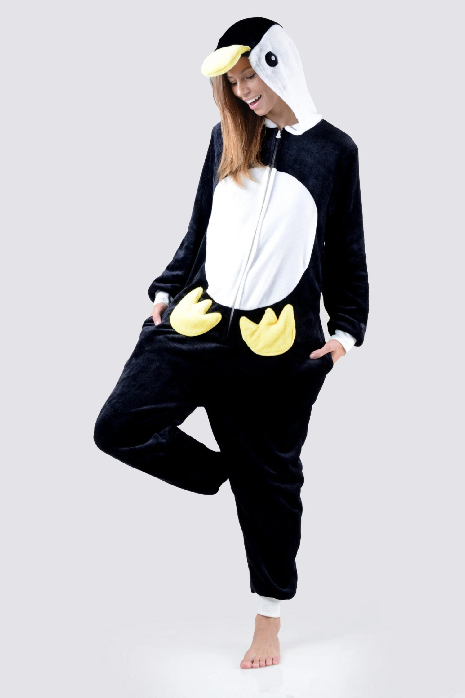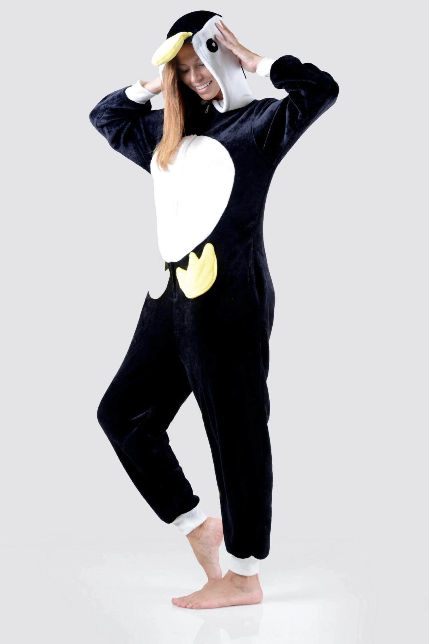 “Look cute and cuddly in this plush penguin onesie to keep cozy while lounging at home!