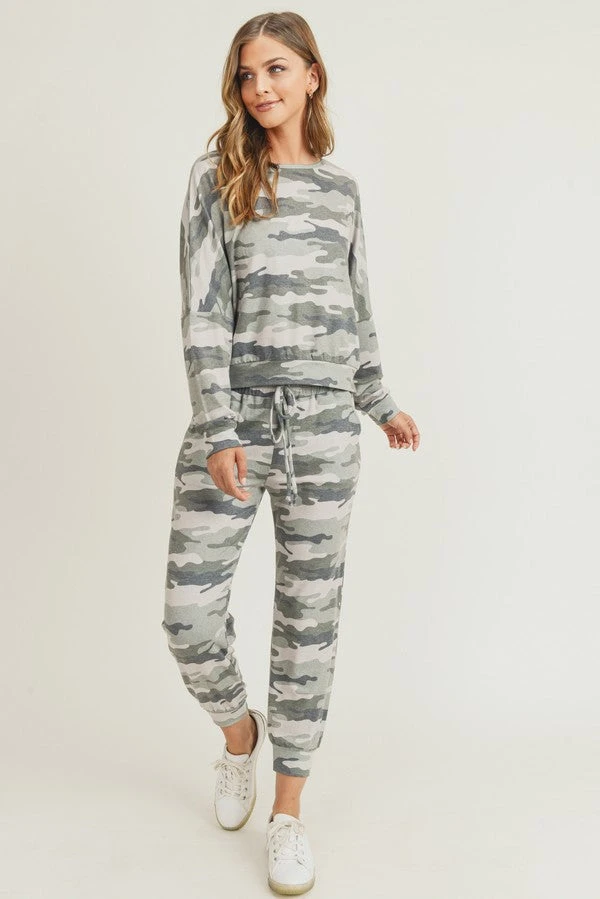 Kick back and relax in this cozy green Relaxed Camo Print Set. This set includes a pair of joggers with a high-rise elasticized waistband and a long sleeve relaxed pullover top.