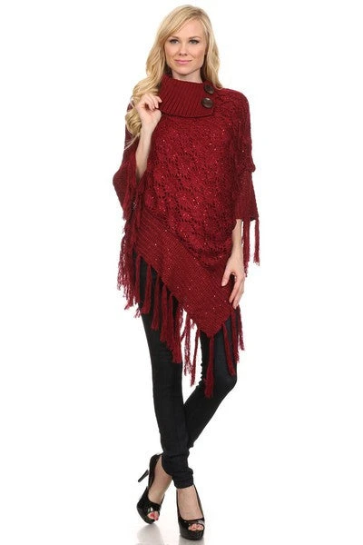 Keep out the winter chill in the style! AÂ knit poncho featuring an all-over horizontal rib and sequin pattern with fringe along the edges.Â