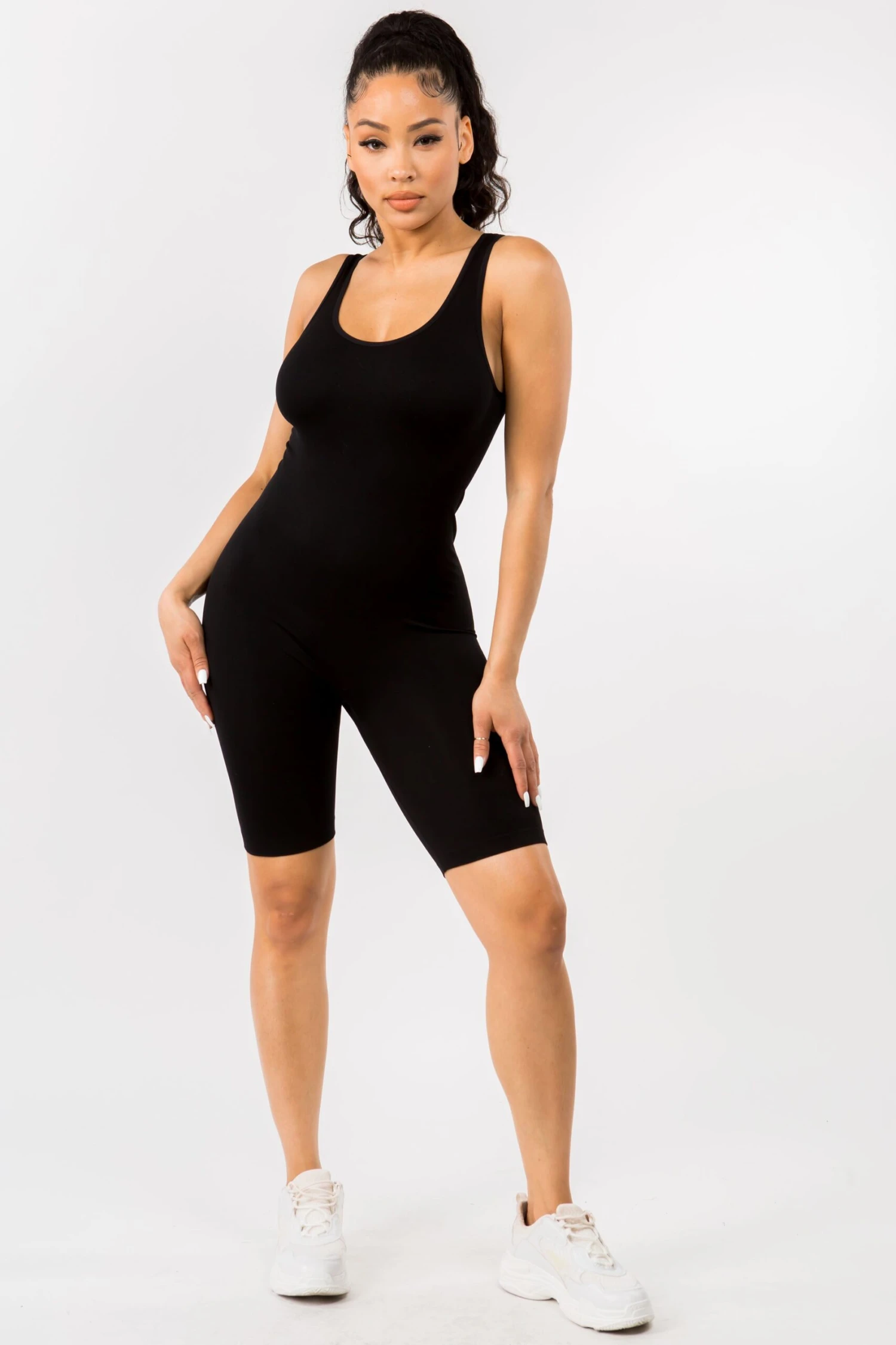 This body-hugging unitard romper features a seamless design, tank top straps, and biker shorts. Be ready to go quick and easy with this sporty fitted romper!