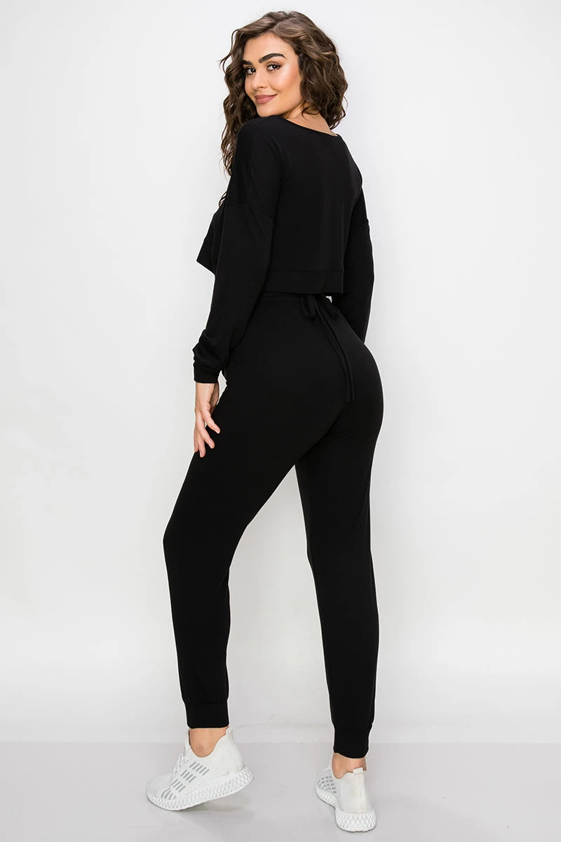 Layer this cozy loungewear set over a sports bra and call it a day. Featuring a high-rise pair of joggers and a cropped sweatshirt that has two strings on each hip to tie around your waist and secure at your comfort. Literally perfect for right after an intense gym sesh.