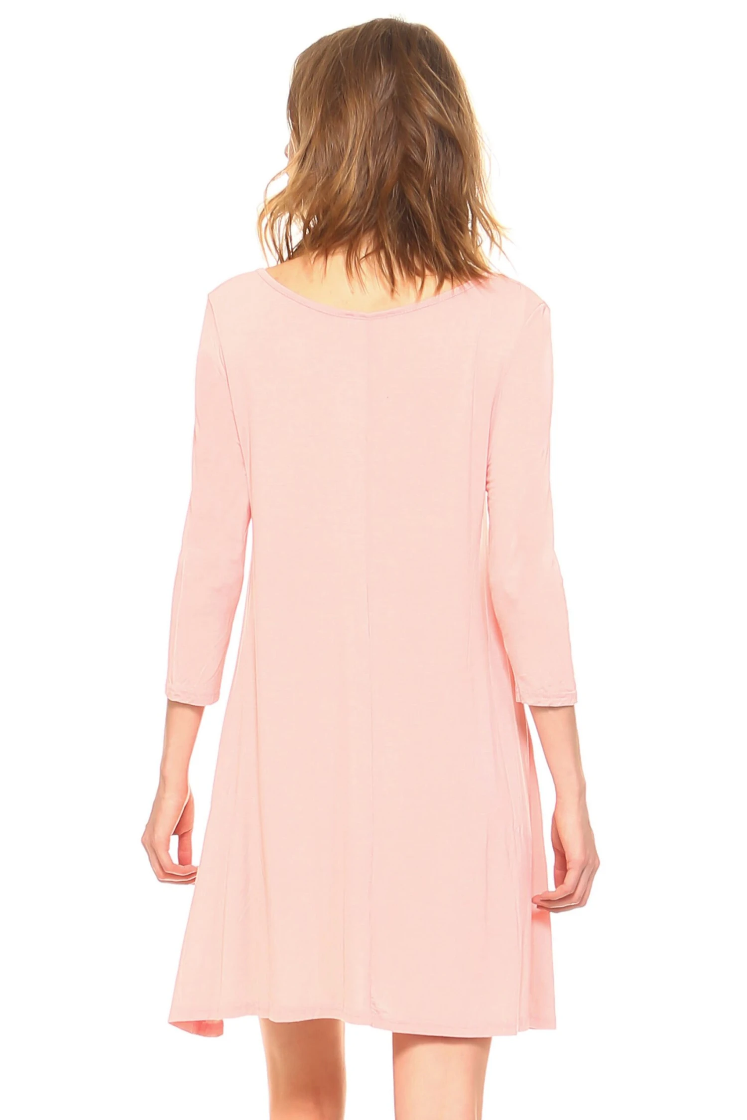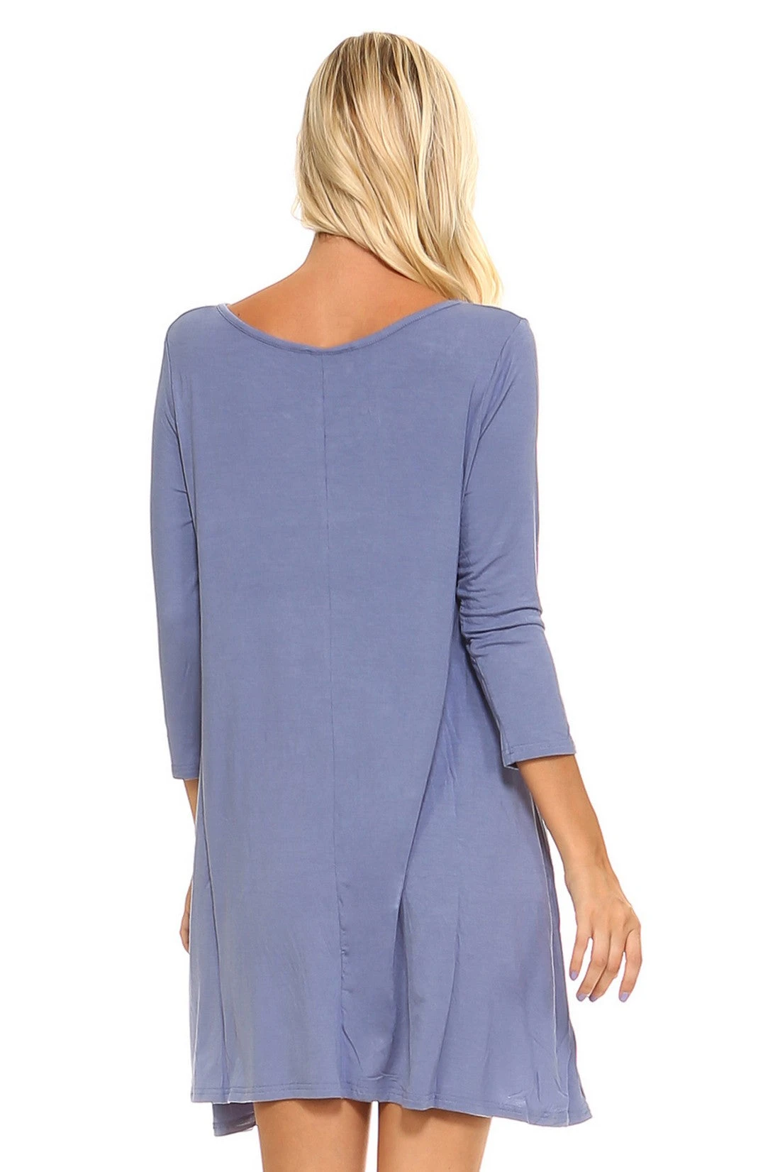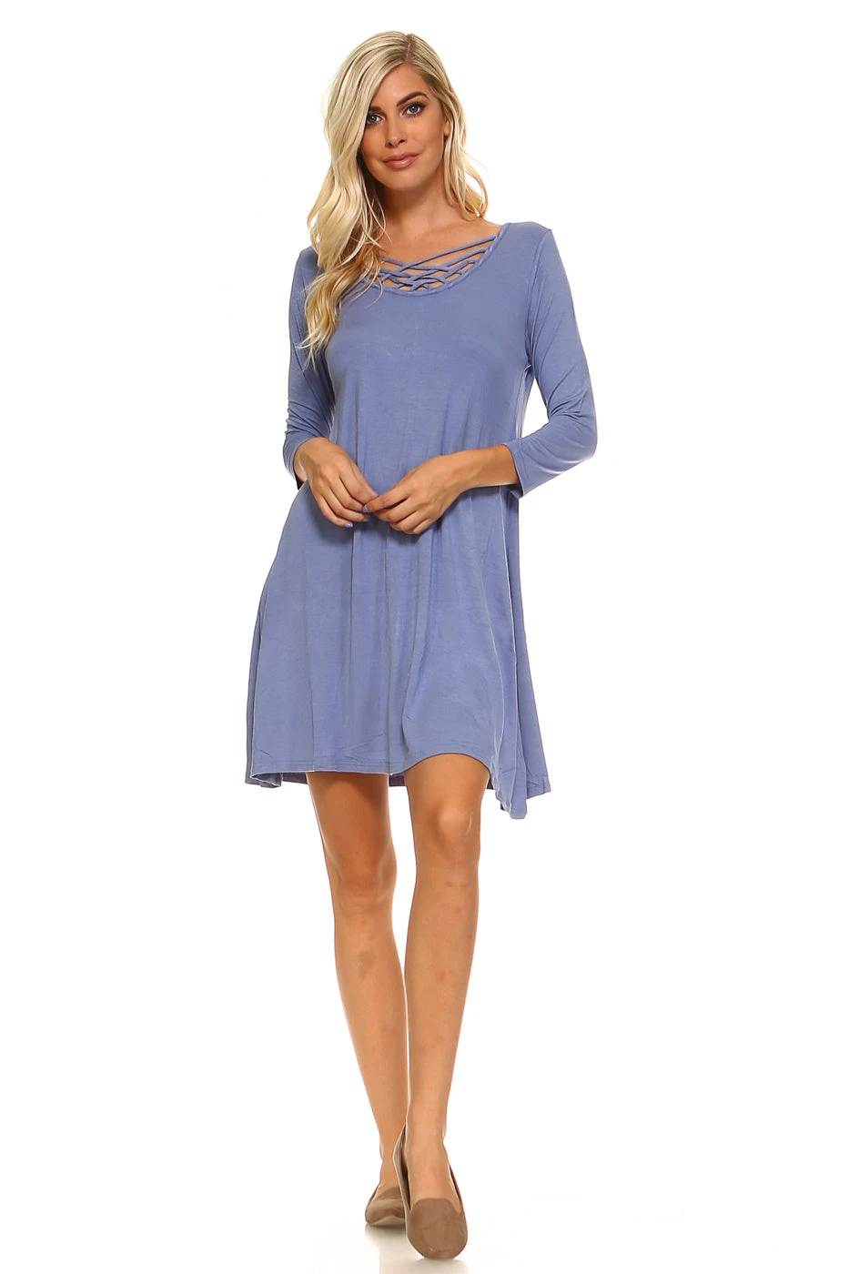Keep it casual in this soft and comfy knit swing dress featuring a scoop neck with a crisscross front and ¾- sleeves. Â