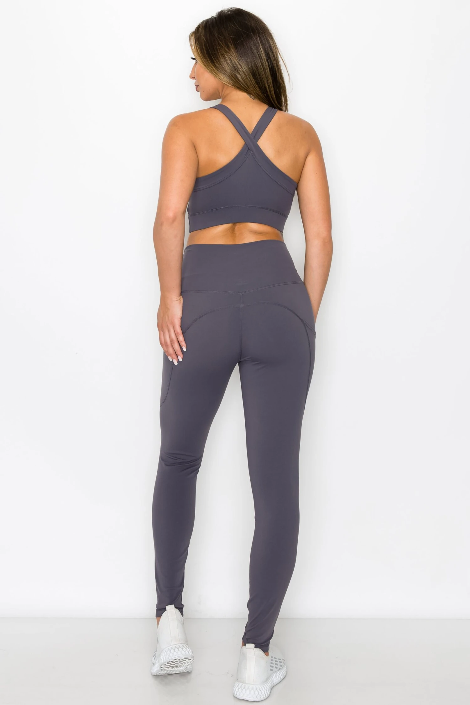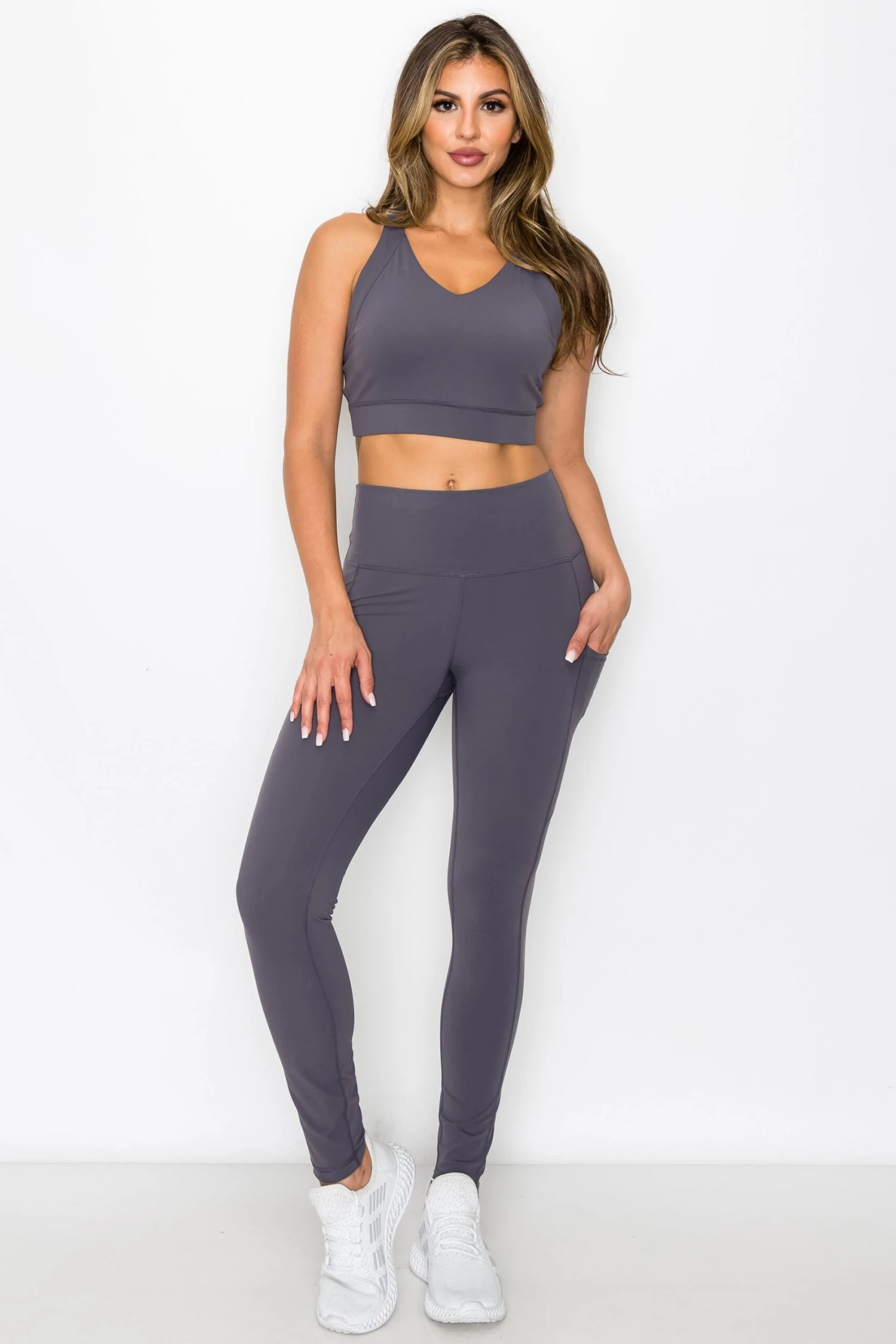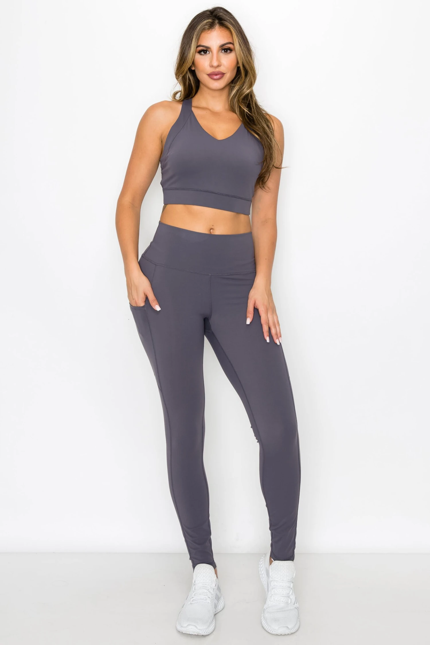 Our popular buttery soft fabric now has a sleek, new two-piece set featuring two outer thigh pockets! This form fitting style is smooth, ultra-soft, and designed for a comfortable workout. In this you will be one step closer to upping your gym gear ANDÂ feeling workout ready.Â