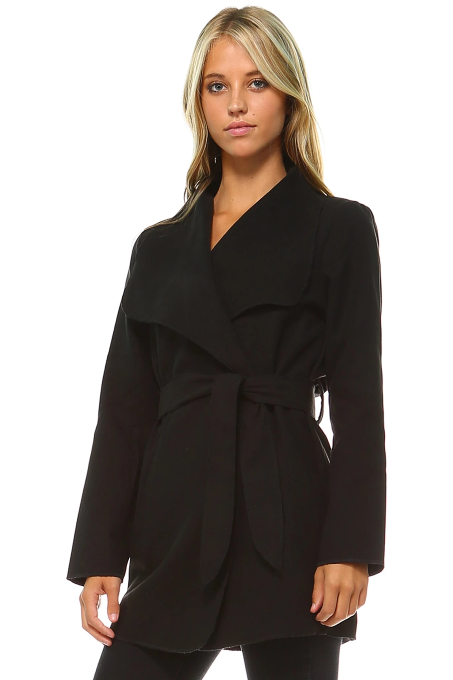 This trench coat features a tie around belt, an open front and two pockets on each hip to keep your hands warm.