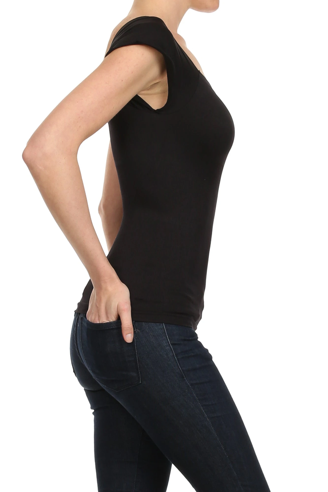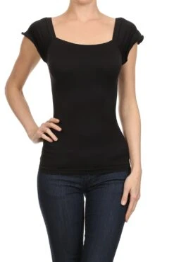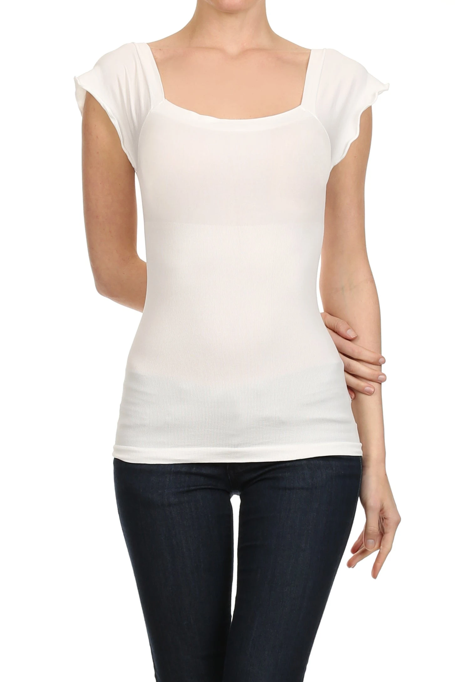 Every girl needs a few good basics in her closet, and this top should fit right in. Frilly, trimmed short sleeves frame a square neckline on a bodycon silhouette. This top features a seamless design which can effortlessly, tuck into your favorite high waisted styles. Â Â