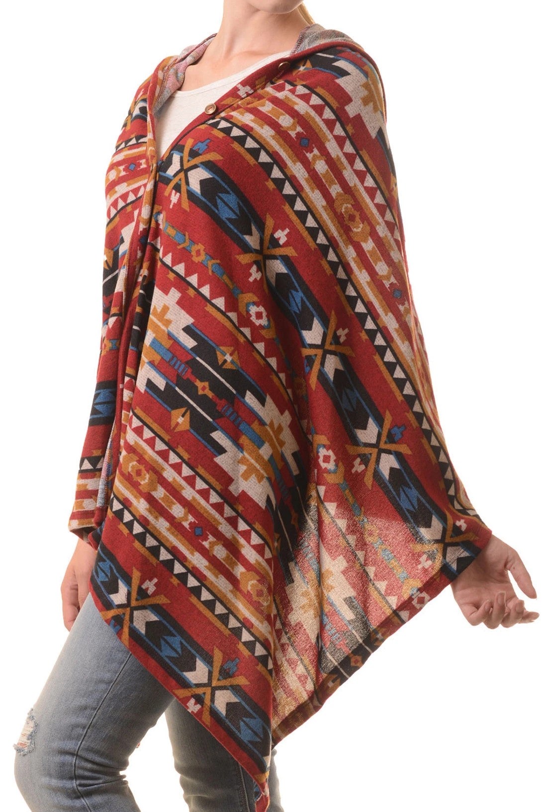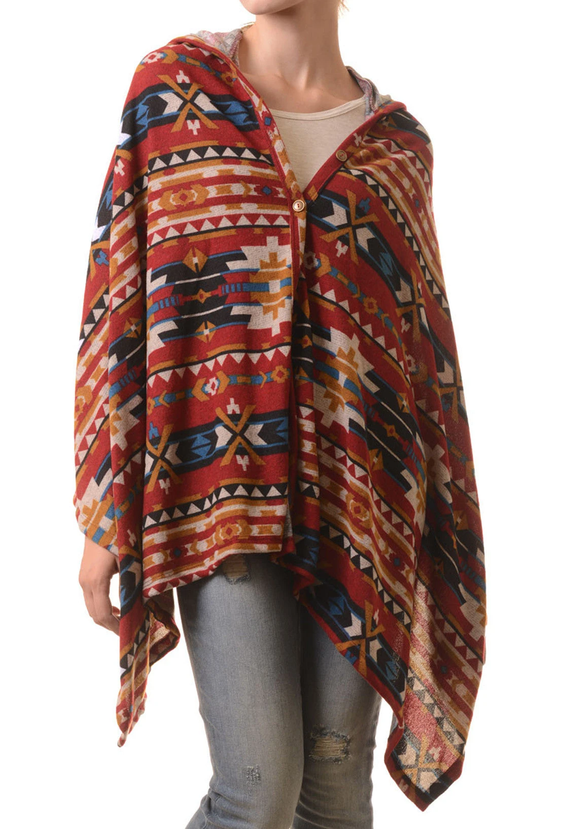 Call it a day with The Wildfire Tribal Poncho. Made to keep you cozy on windy afternoons and brisk nights. Featuring: front button closure, back hood, and super soft Rayon blend. Pair it with boyfriend jeans and slouchy boots for a modern boho look.