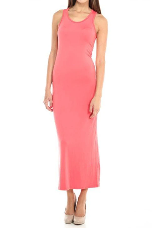 A sleeveless tank maxi dress features a round neckline on a bodycon silhouette. The soft, stretchy knit material feels comfortable when wearing and easy to pull on/off. Perfect for wearing by itself or layered up with a denim jacket.