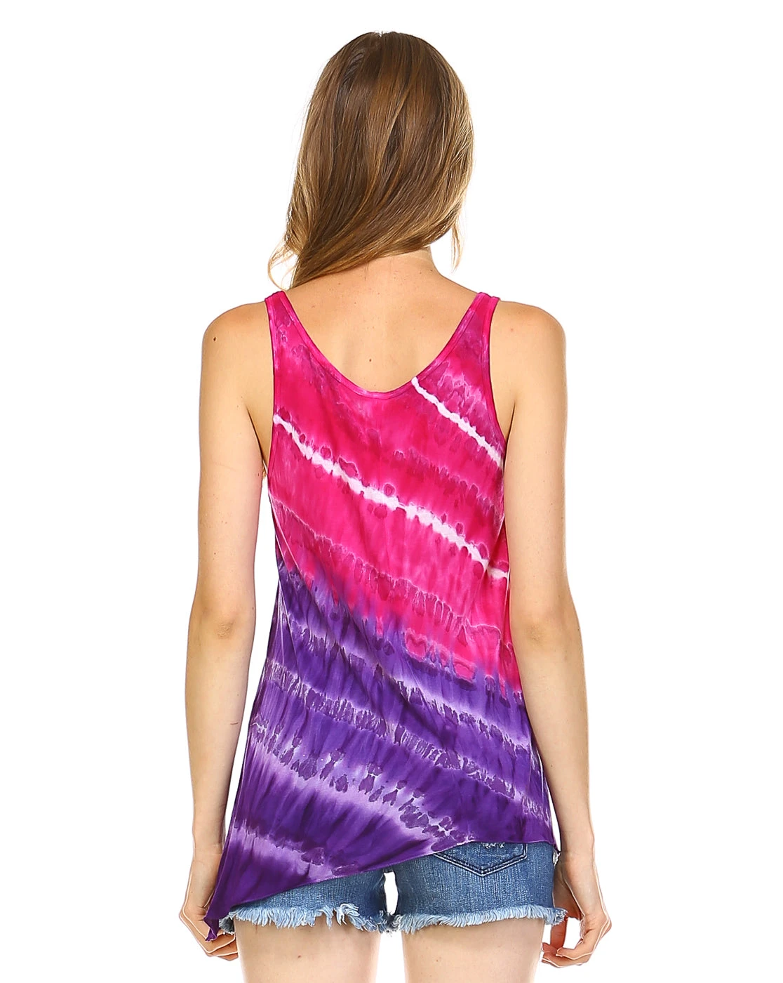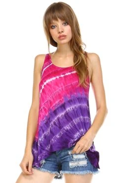 This scoopneck tank top will have them tie dying over you! It features a premium tie dye print, uneven hem, and an easy pullover style. Perfect for all your beach days and everyday summer wardrobe. Â