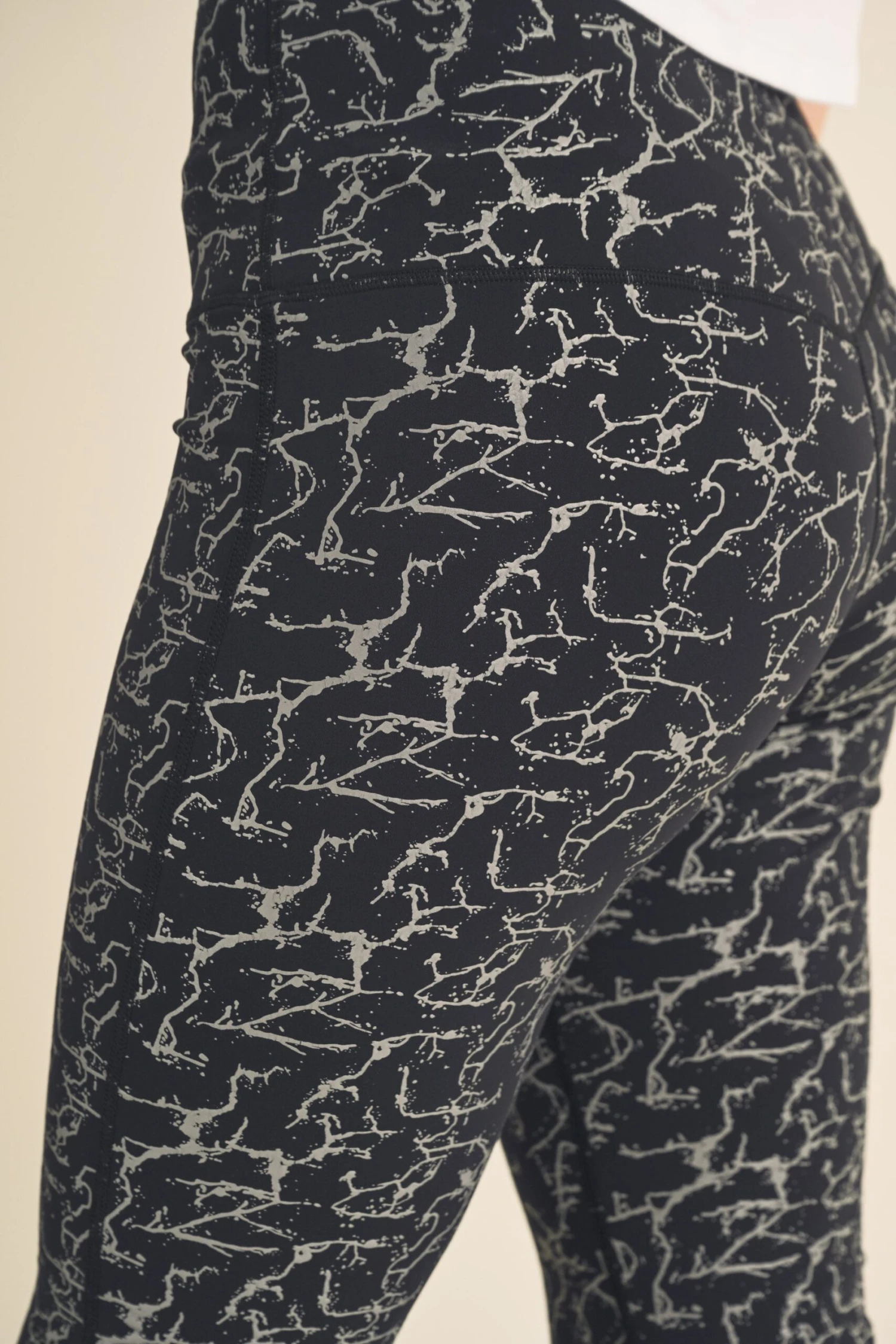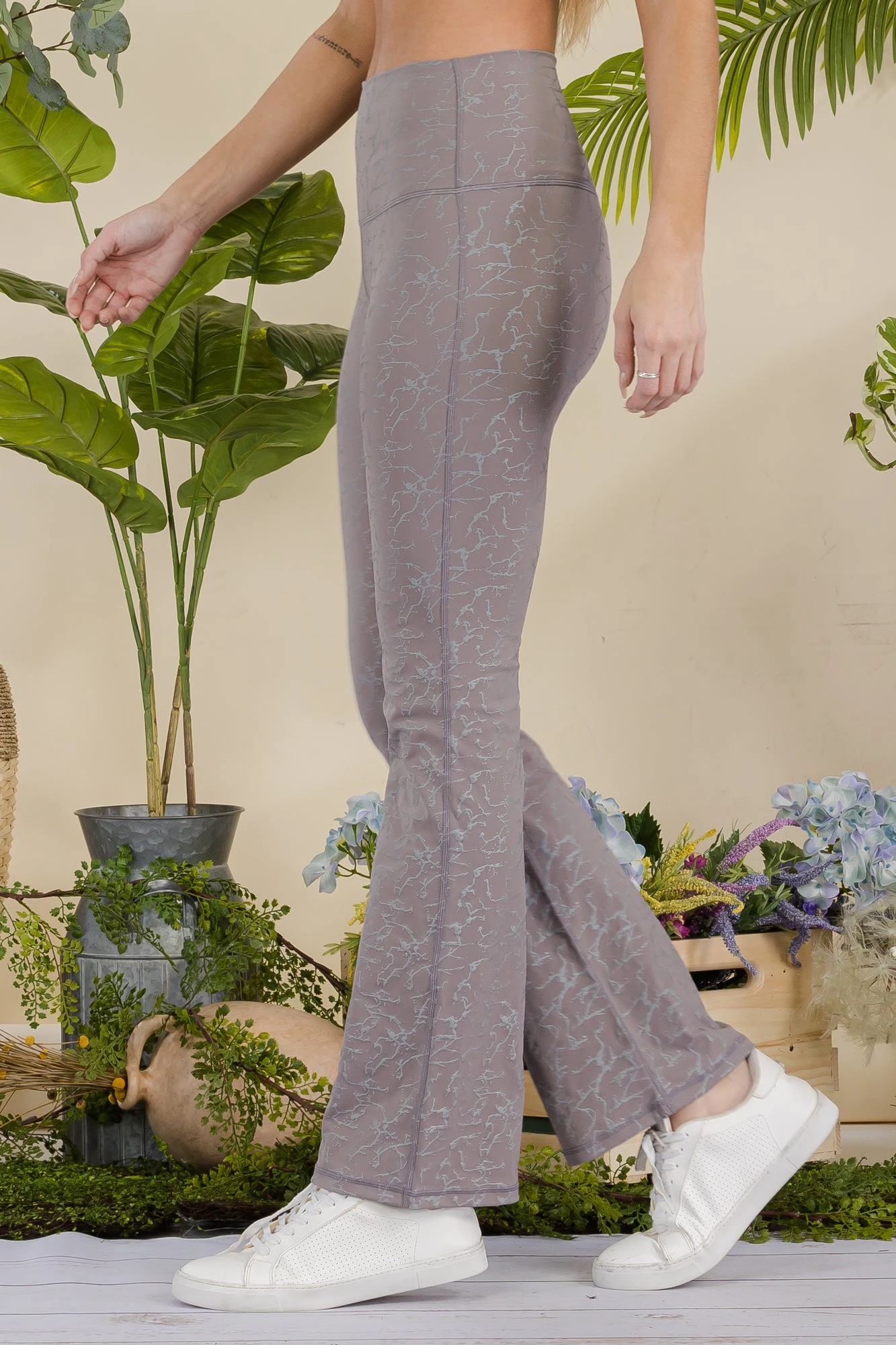 Take on a bold style and enjoy the comfort of this ultra-flattering flared active pant. It features a fitted waistband, silver paint splatter pattern, and flared ankle for a statement look that never sacrifices practicality!