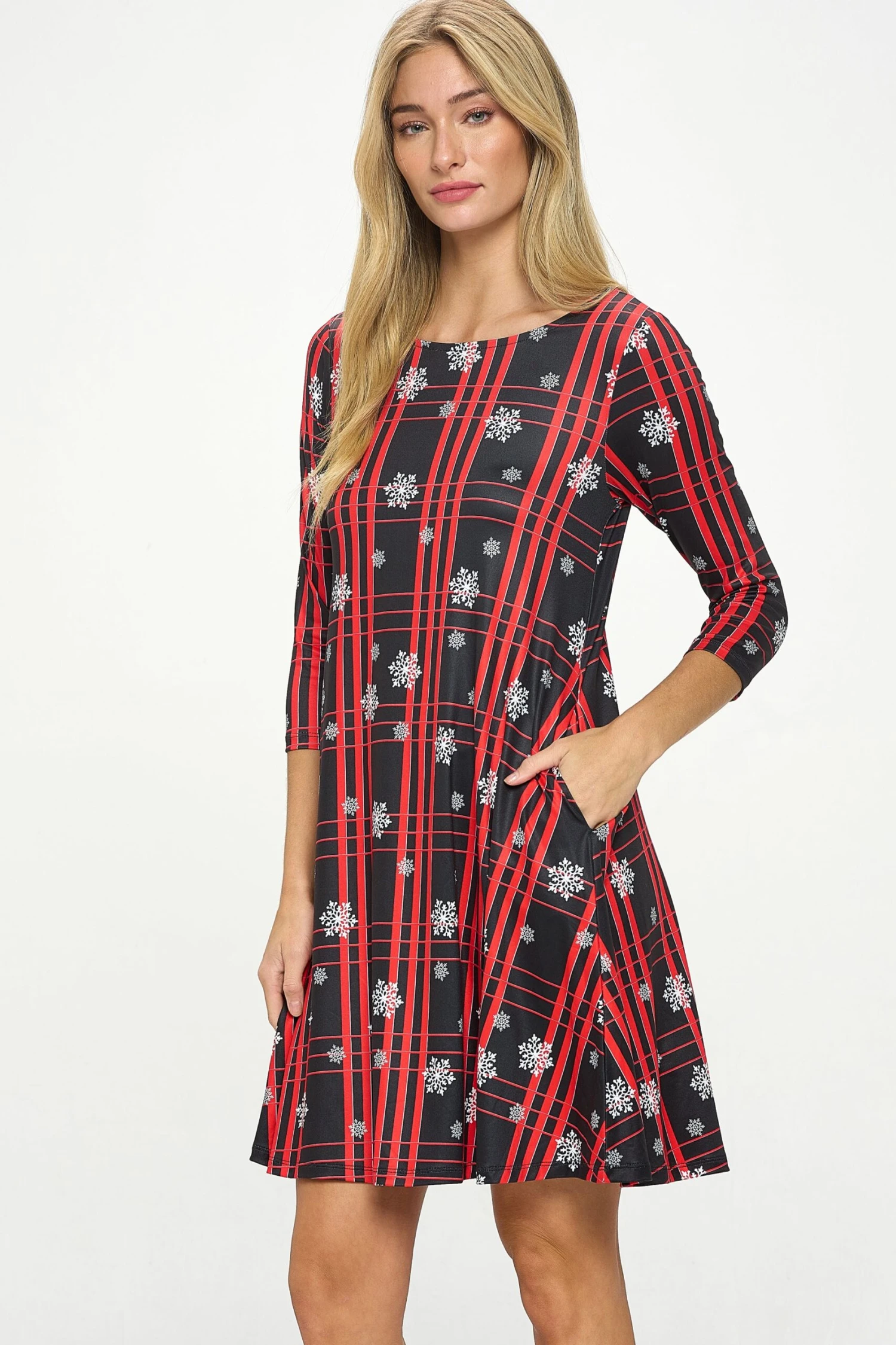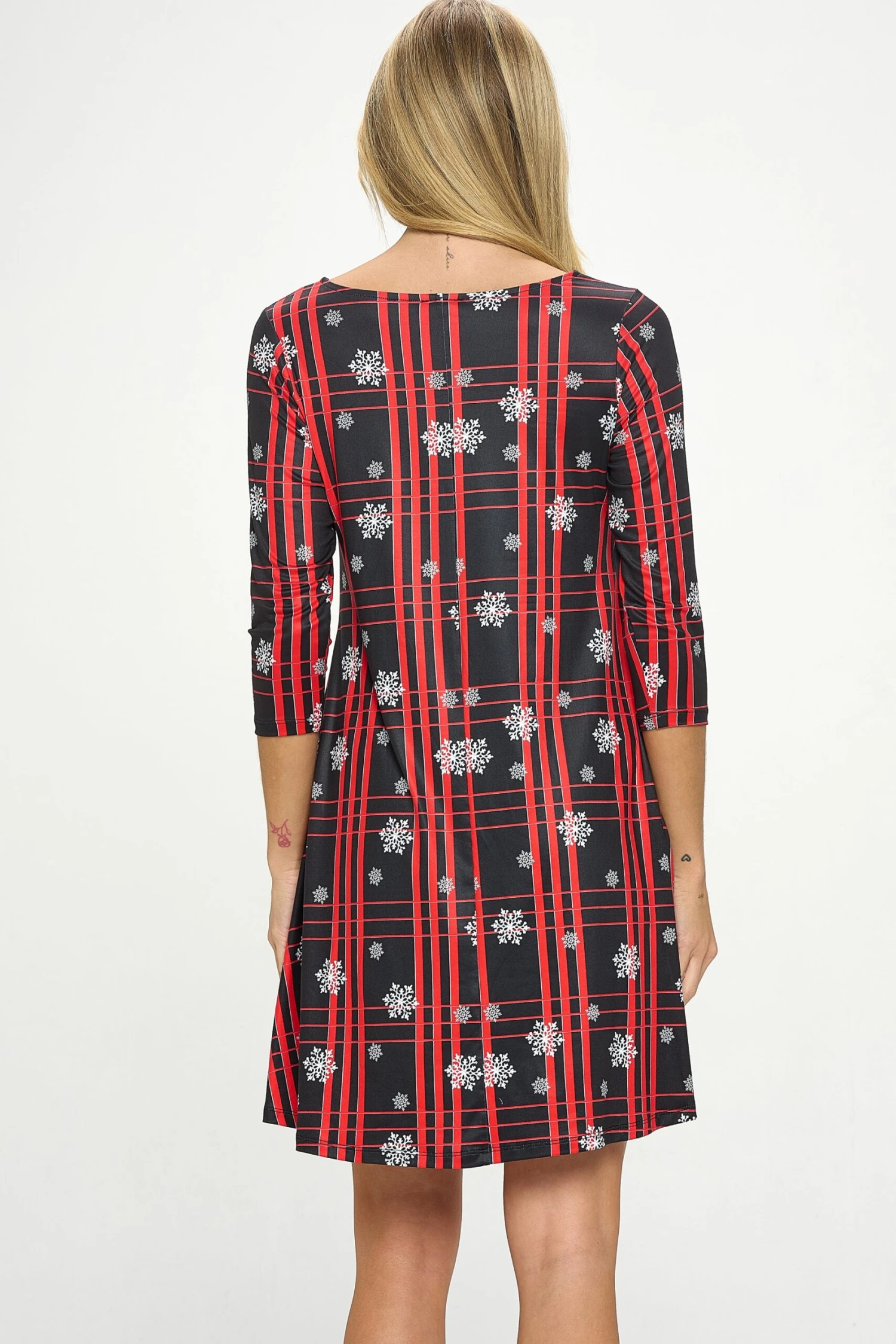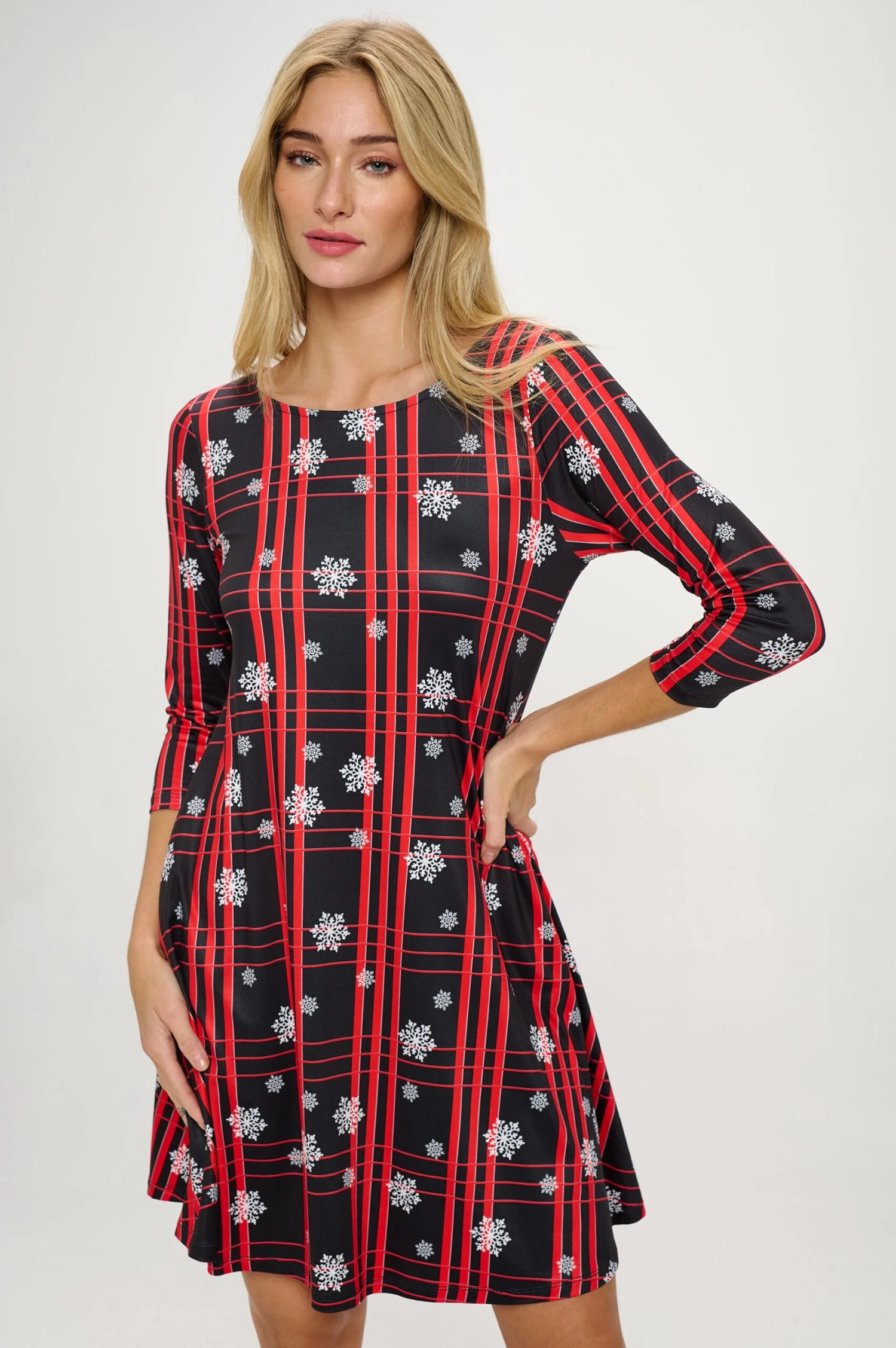 Lightweight and soft A-line dress, designed for the holiday season. Features 3/4 length sleeves, round neckline, and a classic plaid pattern.