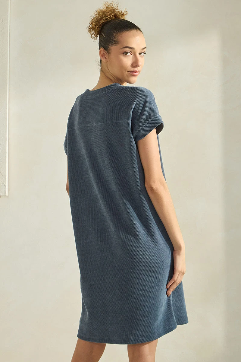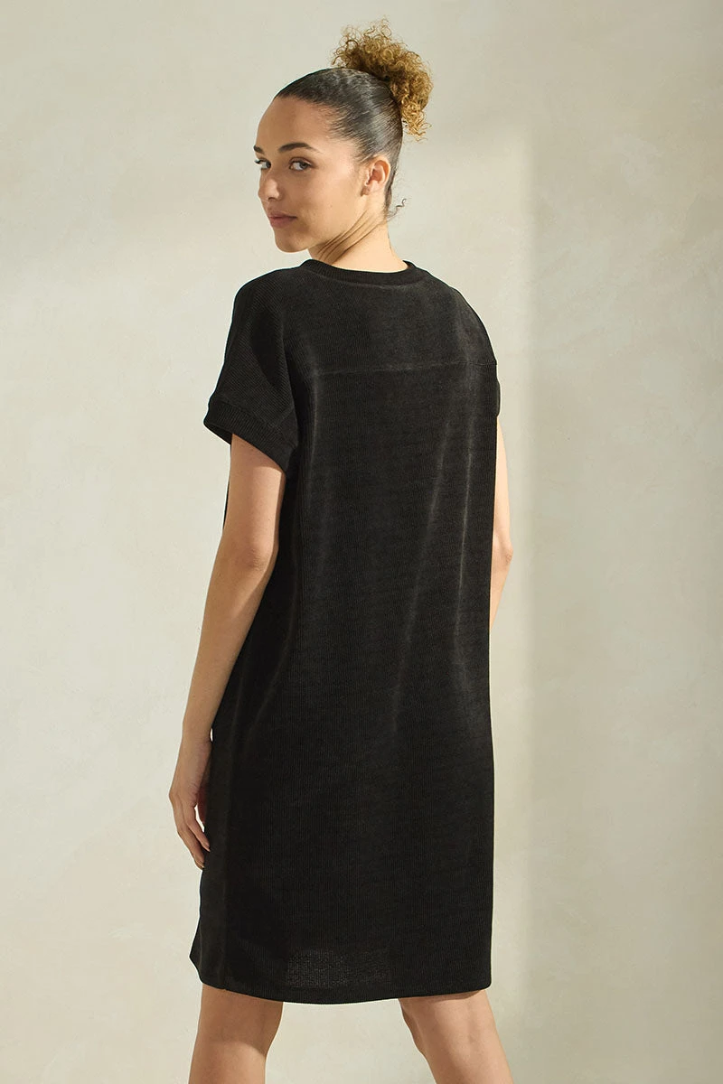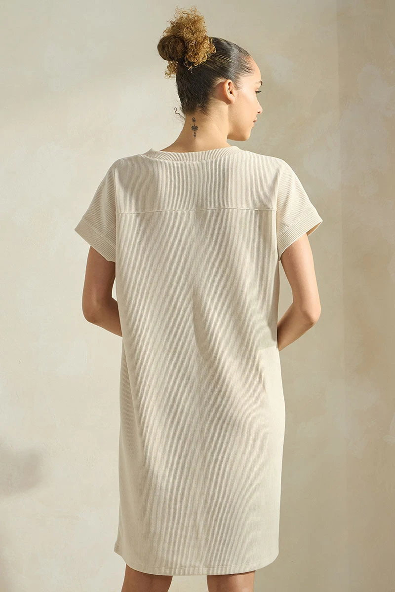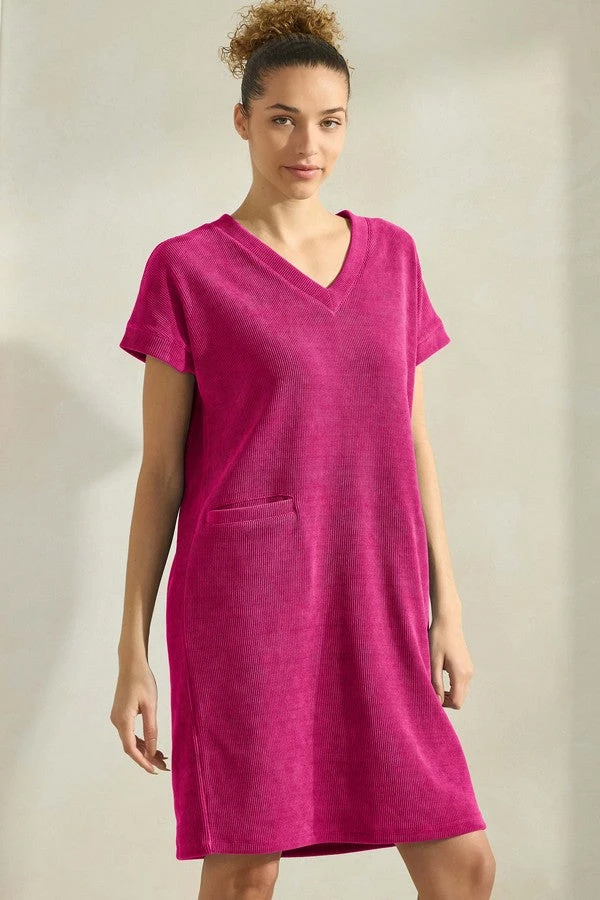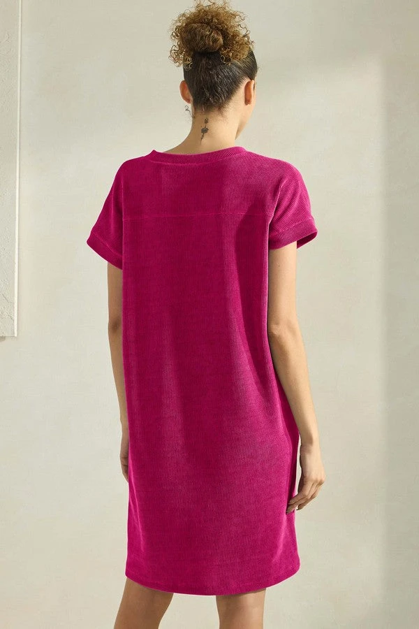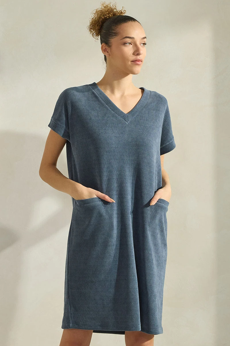 Slip into the perfect balance of effortless style and everyday ease with this chic V-neckline dress. Designed with a flattering shift silhouette that skims your curves, it features short sleeves with tailored hem bands and discreet pockets for a touch of functional elegance.