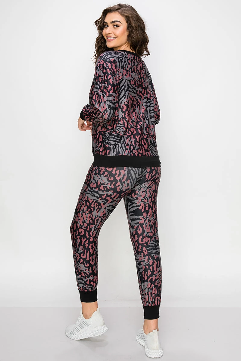 This colorful combination of zebra and cheetah print will keep you cozy and stylish during this cooler weather. Featuring a relaxed long sleeve and a matching pair of printed joggers, this cute matching two piece set is perfect for lounging at home or catching up on your beauty sleep.
